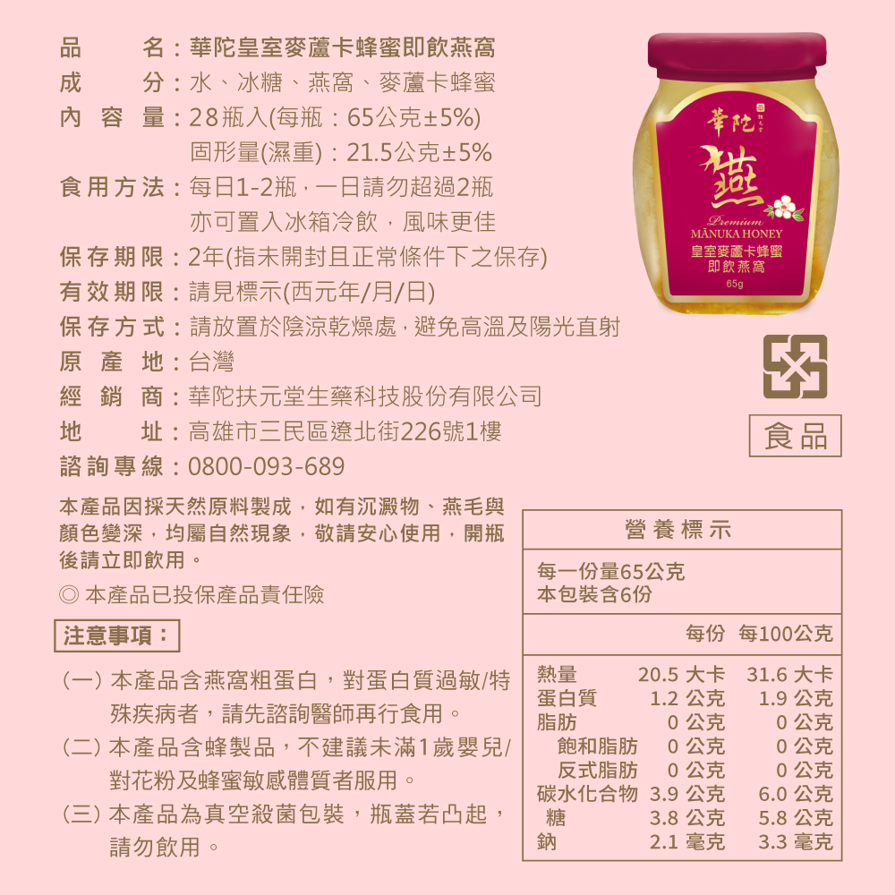 名稱:【華陀扶元堂】御禮之選-皇室麥蘆卡燕窩飲禮盒(28入/盒) 麥蘆卡蜂蜜/養顏/孕婦滋補
