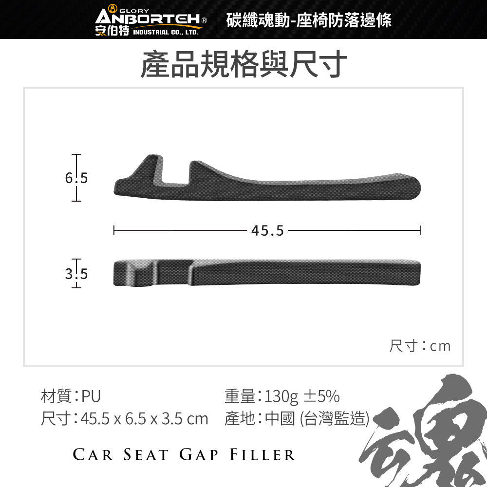 商品規格品名:【安伯特】碳纖魂動 座椅防落邊條型號:ABT-A190材質:PU尺寸:45.5x6.5x3.5cm ±5%重量:130g ±5%保固範圍:新品暇疵產地:中國(台灣監造)
