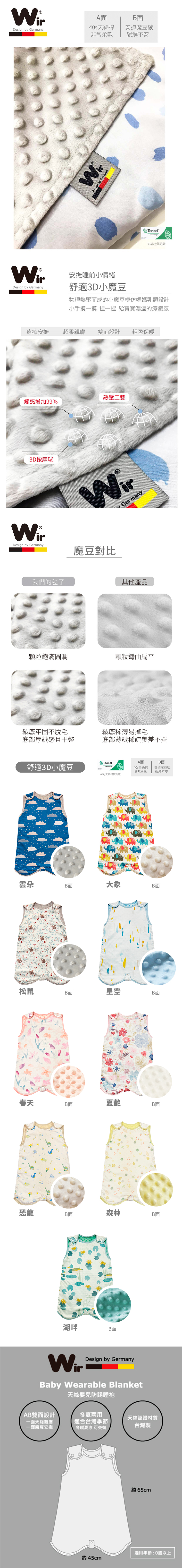 品牌:Wir 秘婭品名:天絲魔豆防踢睡袍款式:大象款/松鼠款/恐龍款/雲朵款/星空款/湖畔款/森林款/春天款/夏艷款材質:A面40支天絲(30% Lyocell萊賽爾纖維+70% Viscose 縲縈) / B面魔豆(100% Polyester聚酯纖維底料)尺寸:65*45cm外包裝尺寸:45x35cm*0.5cm重量:330g適用年齡:新生兒以上貨源:公司貨品牌國家:德國產地:台灣BSMI:M73958
