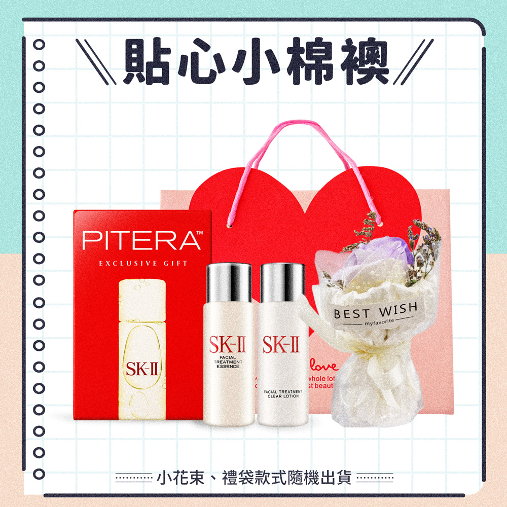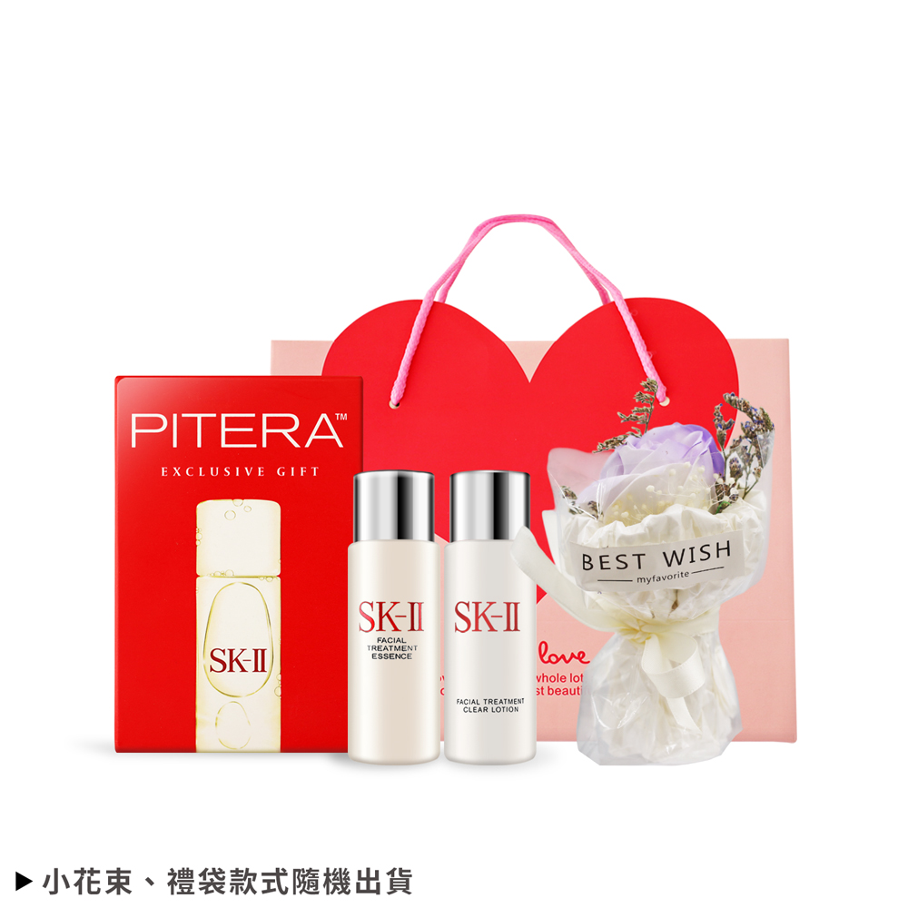規格:1.SK-II 經典兩件套(青春露30ml+亮采化妝水30ml)-國際航空版2.O'Pretty 歐沛媞 迷你小花束(隨機出貨)3.O'Pretty 歐沛媞 愛心祝福禮袋(10X17X22cm)-小(隨機出貨)