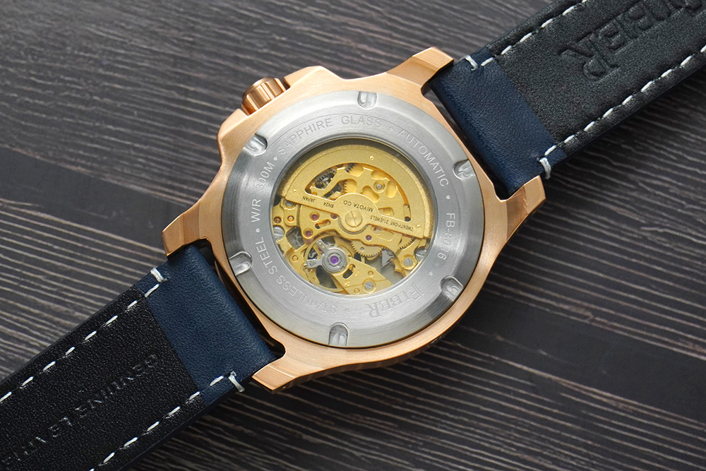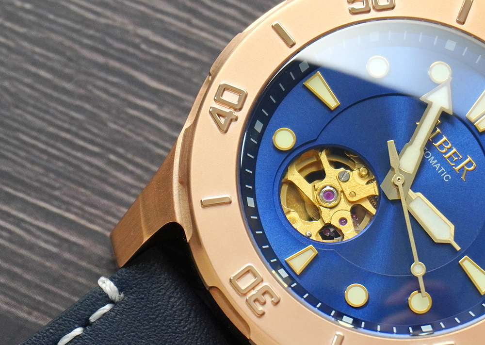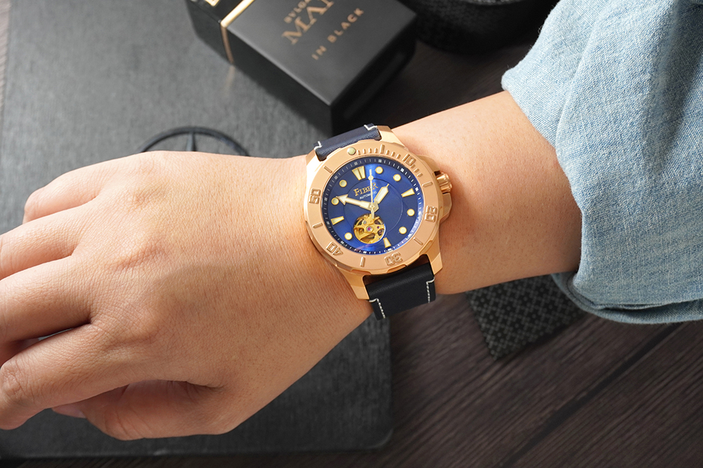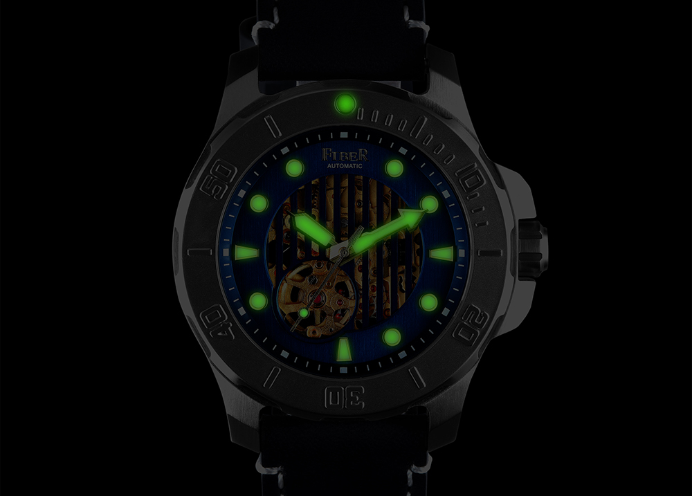 鏤空錶背設計讓您在賞錶時,也可以一覽無遺!錶盤設計,搭配潛水錶必備大時標顯示