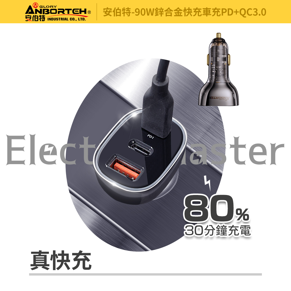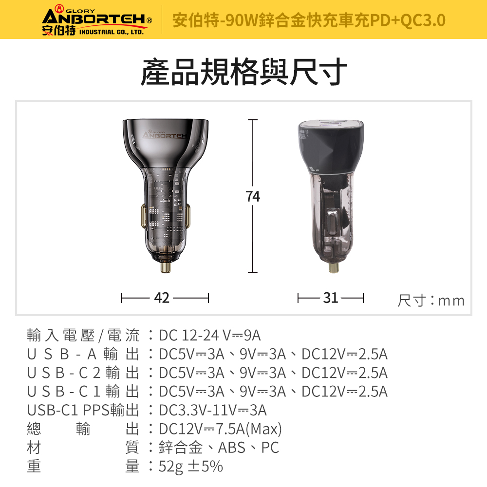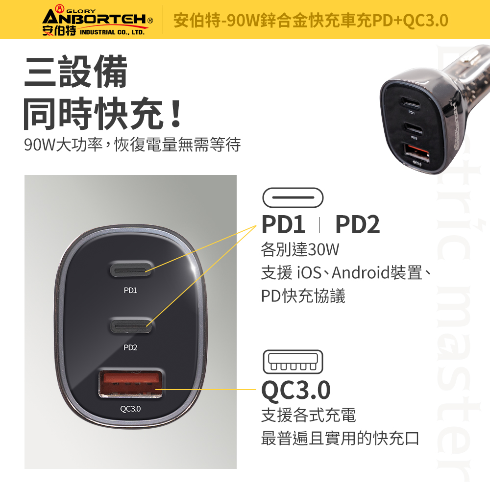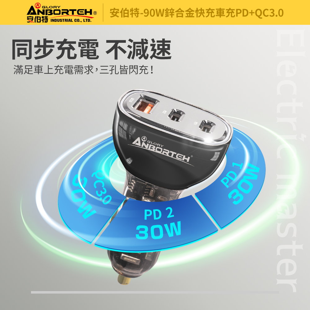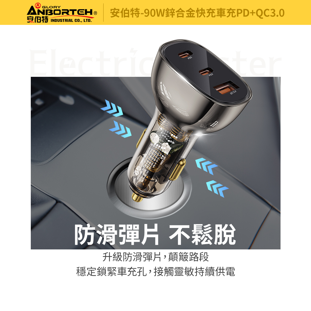 【安伯特】90W鋅合金快充車充PD+QC3.0三孔同時輸出高效能快充,讓您滿電出遊