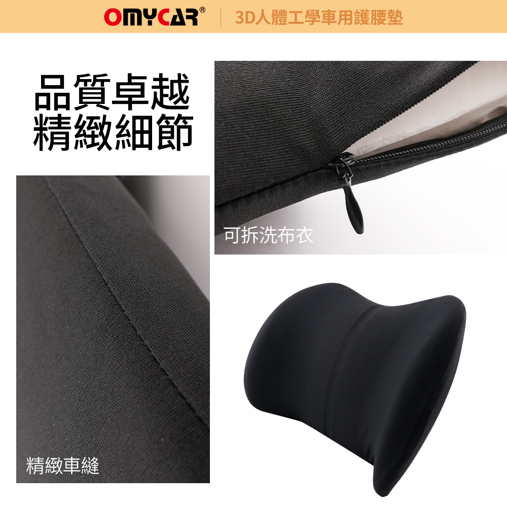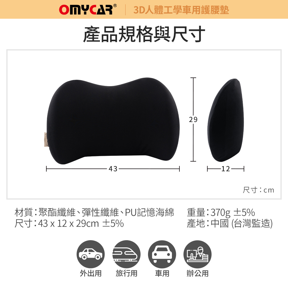 品名:【OMyCar】3D人體工學車用護腰墊材質:聚脂纖維、彈性纖維、PU記憶海綿尺寸:43x12x29cm ±5%重量:370g ±5%