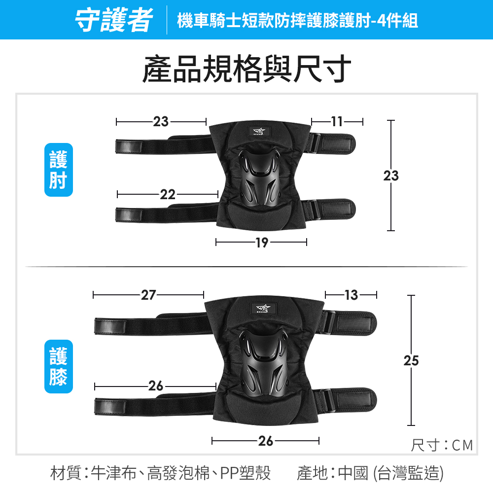 商品規格品名:【守護者】機車騎士 短款防摔護膝護肘材質:牛津布、高發泡棉、PP塑殼尺寸:護膝25x26cm ±5%、護肘23x19cm ±5%重量:520g ±5%保固範圍:新品暇疵產地:中國(台灣監造)