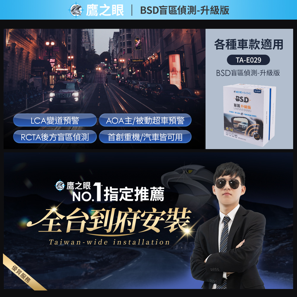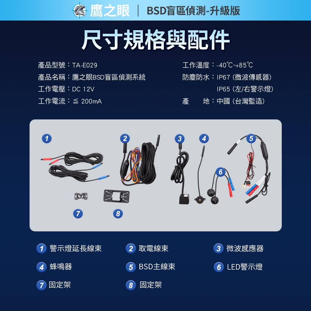 商品規格商品品名:【鷹之眼】BSD盲區偵測-升級版商品型號:TA-E029NCC 認證:CCAB19LP1100T6工作電壓:DC12V防塵防水:IP67(微波傳感器)、IP65(左/右警示燈)商品重量:1000g ±5%保固範圍:新品暇疵保固期限:保固一年(非人為因素下)商品產地:中國(台灣監造)