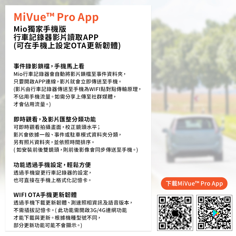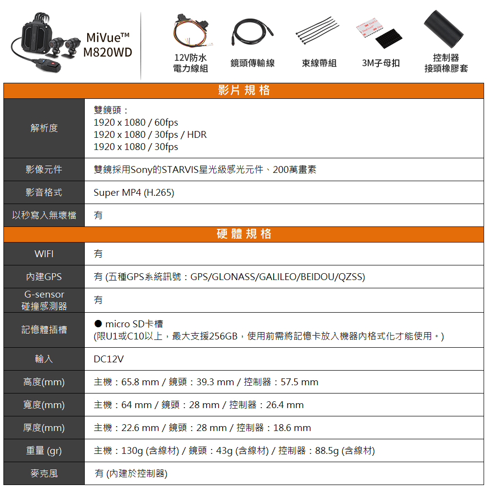 商品規格品名:Mio M820WD 行車記錄器BSMI字號:R45630主機尺寸:65.8x64x22.6 mm ±5%鏡頭尺寸:39.3x28x28 mm ±5%控制器:57.5x26.4x18.6 mm ±5%主機重量(含線):130g ±5%鏡頭重量(含線):43g ±5%控制器重量(含線):88.5g ±5%保固範圍:新品暇疵保固期限:原廠主機保固三年,配件三個月產地:中國