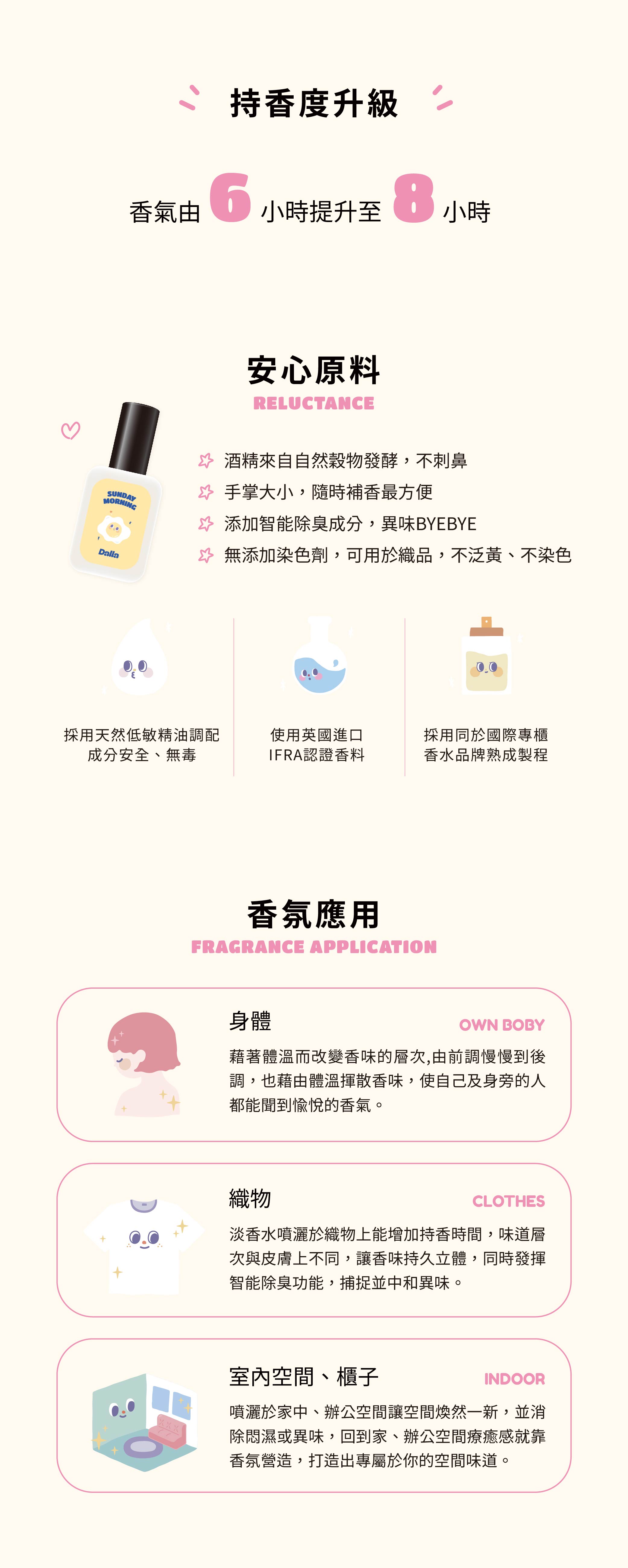 材質:玻璃、液體功能:噴拭於耳後、頸部、手腕等部位,增添香氣、創造美好心情。容量:35ml±10%
