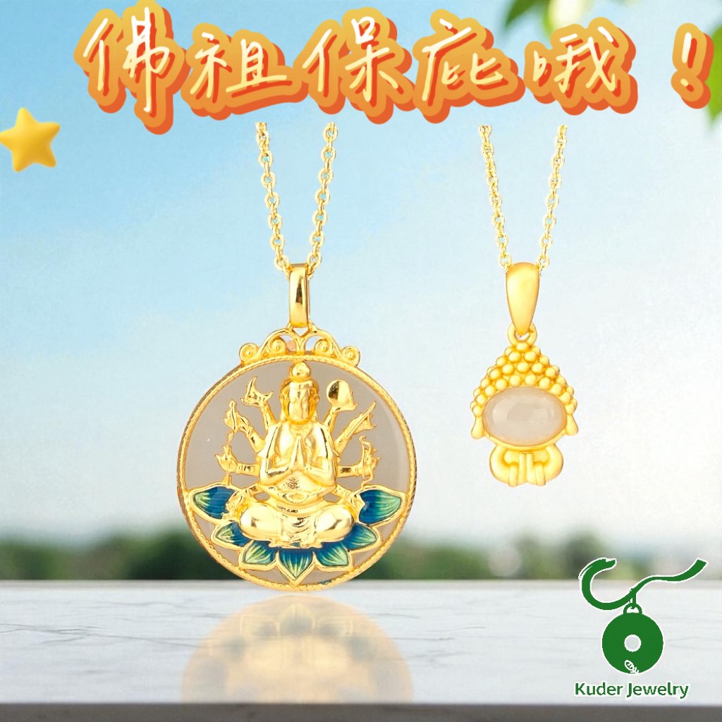 墜台為S925銀鍍金, 千手觀音還加琺瑯彩工藝. 金工工藝純金鍍金不易掉色.用銀飾價格買如同黃金質感.