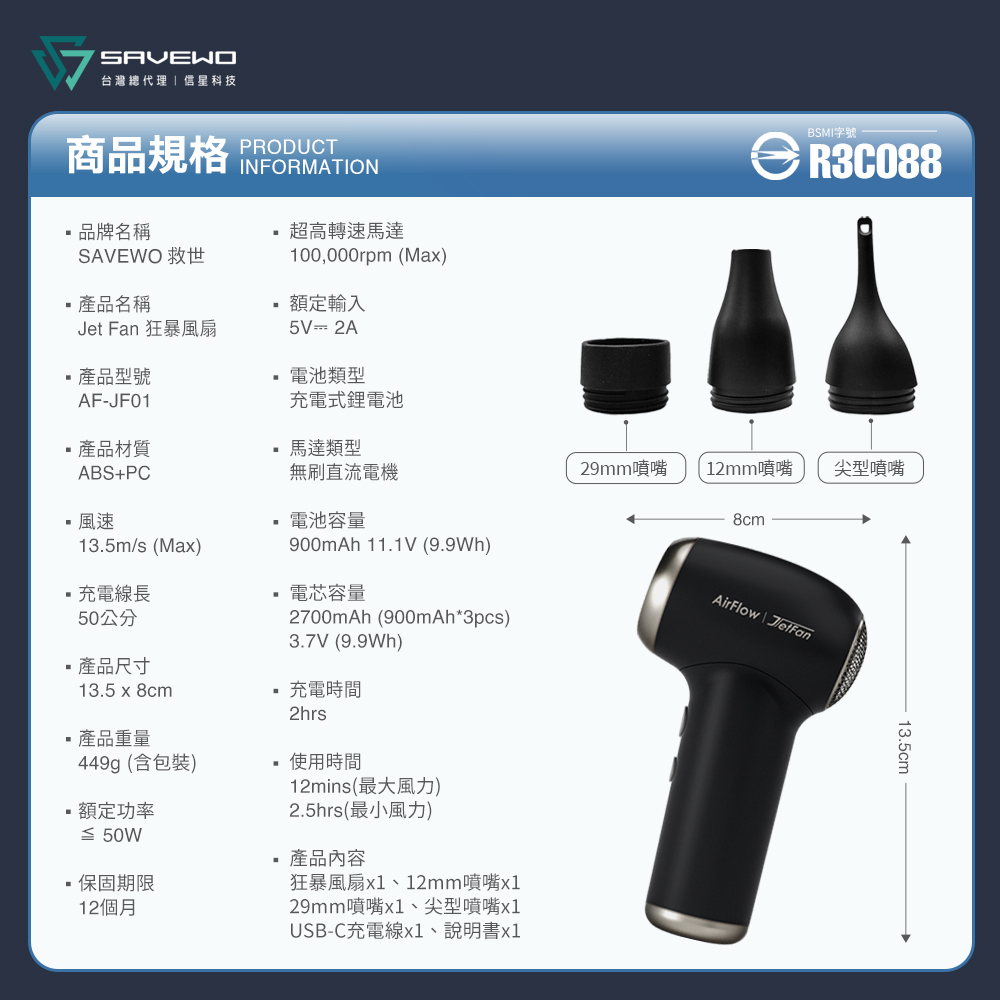 產品內容:狂暴風扇x1、12mm噴嘴x1、29mm噴嘴x1、尖型噴嘴x1、USB-C充電線x1、說明書x1