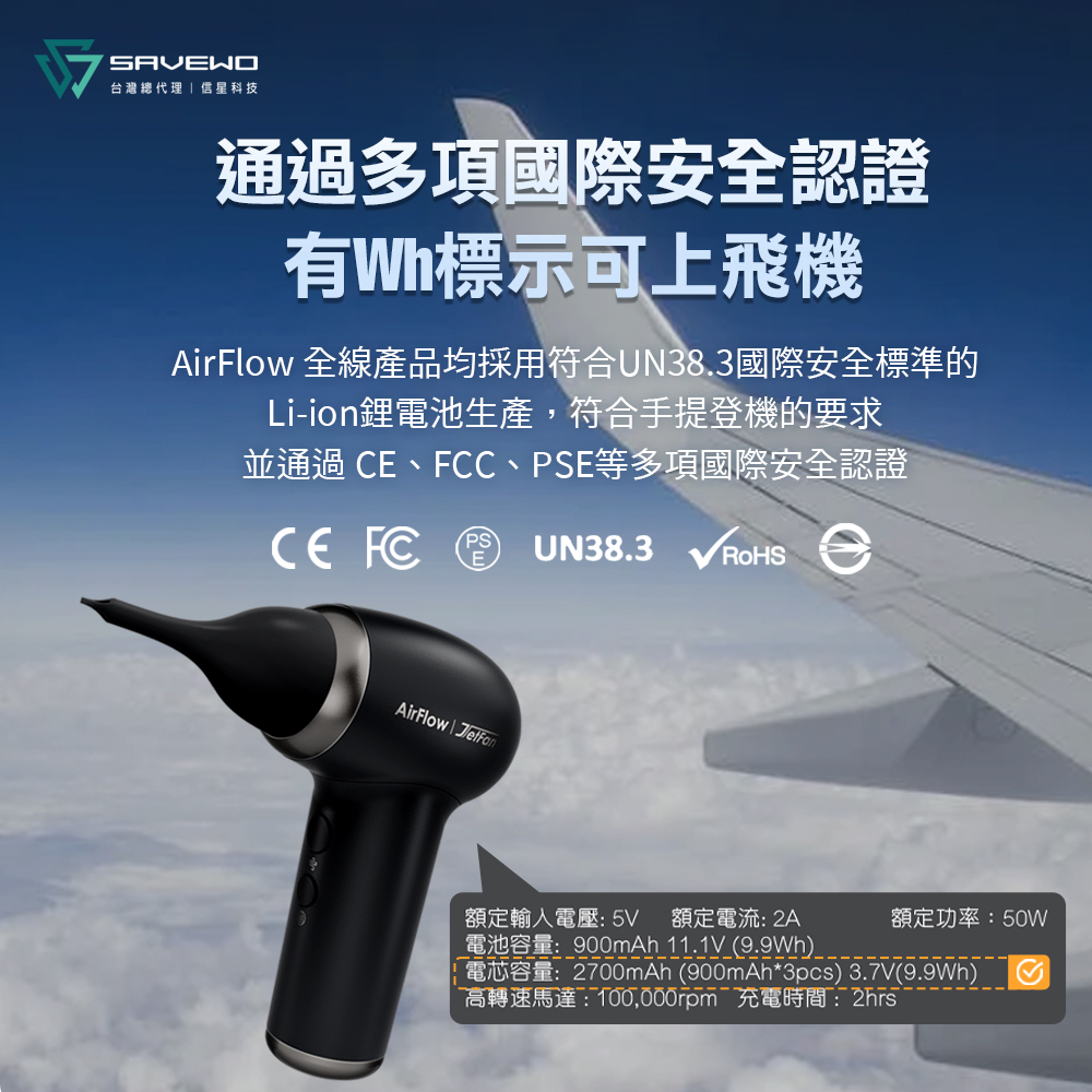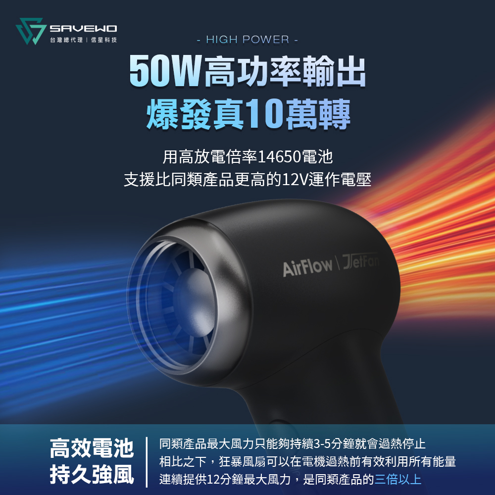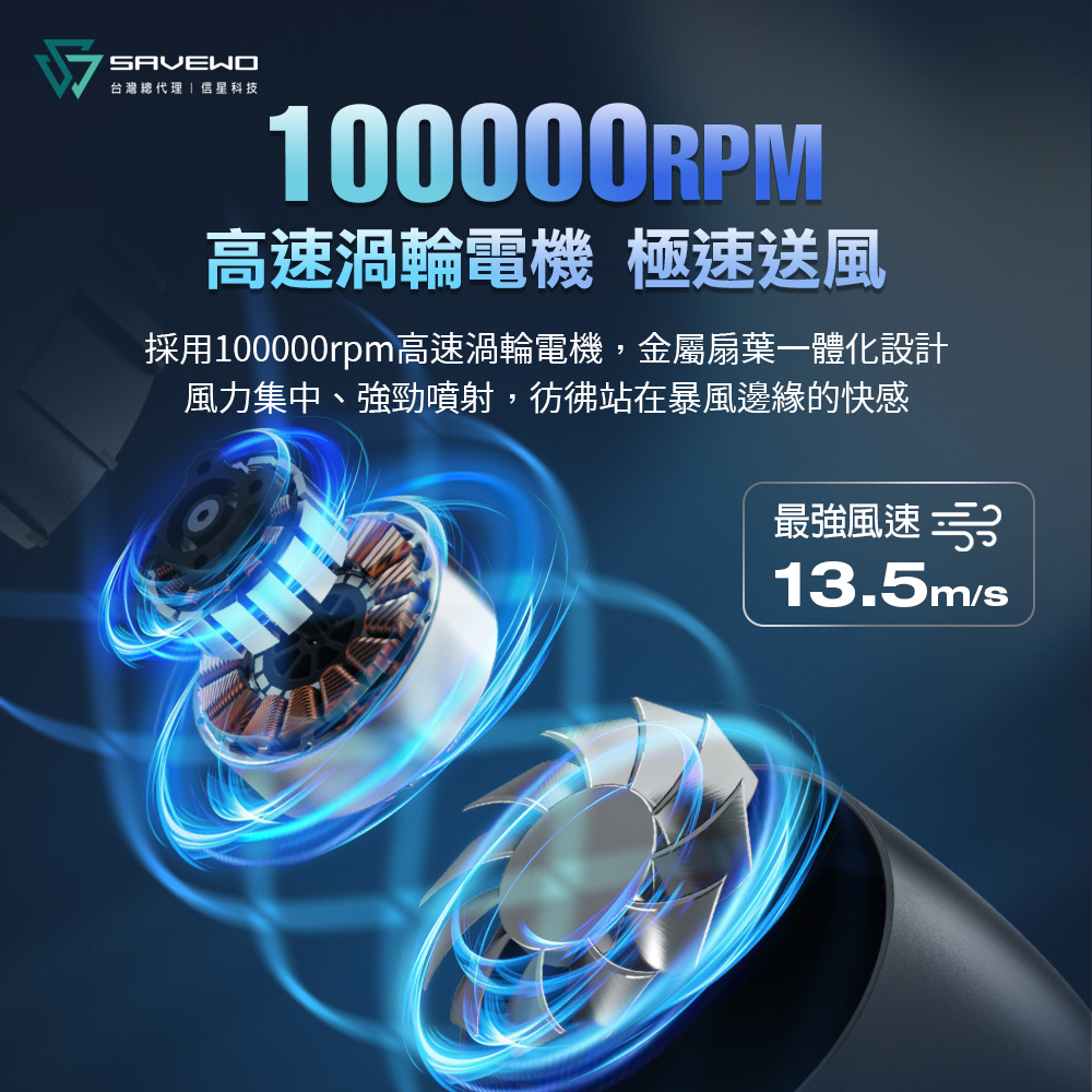 強勁噴射:配備100,000rpm高速渦輪電機金屬扇葉,風速高達13.5m/s