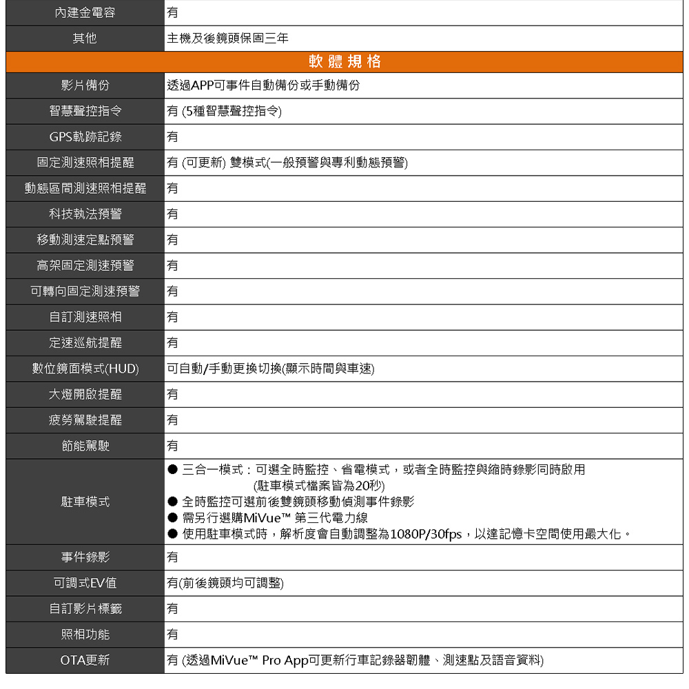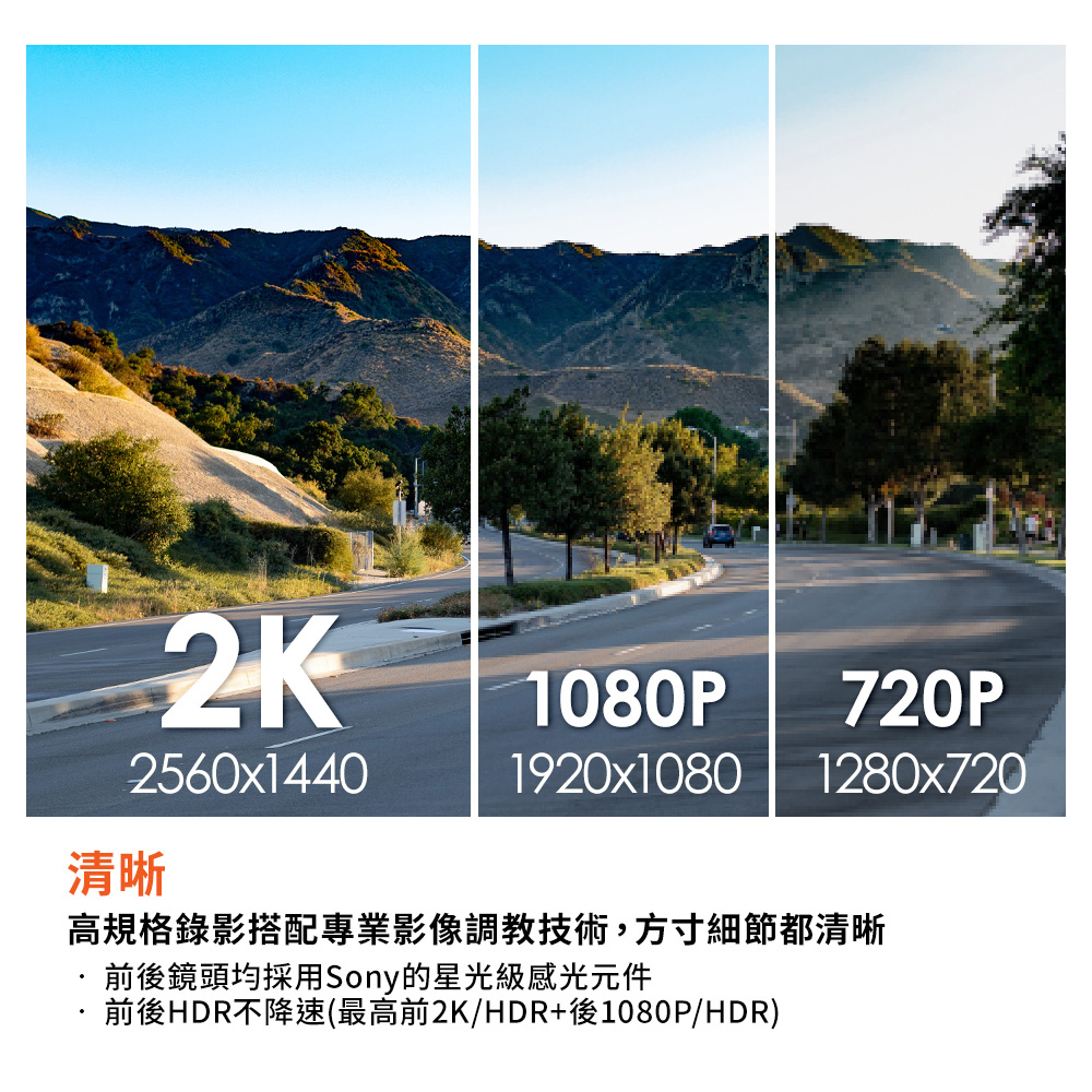 清晰高規格錄影搭配專業影像調教技術,方寸細節都清晰‧ 前後鏡頭均採用Sony的星光級感光元件‧ 前後HDR不降速(最高前2K/HDR+後1080P/HDR)