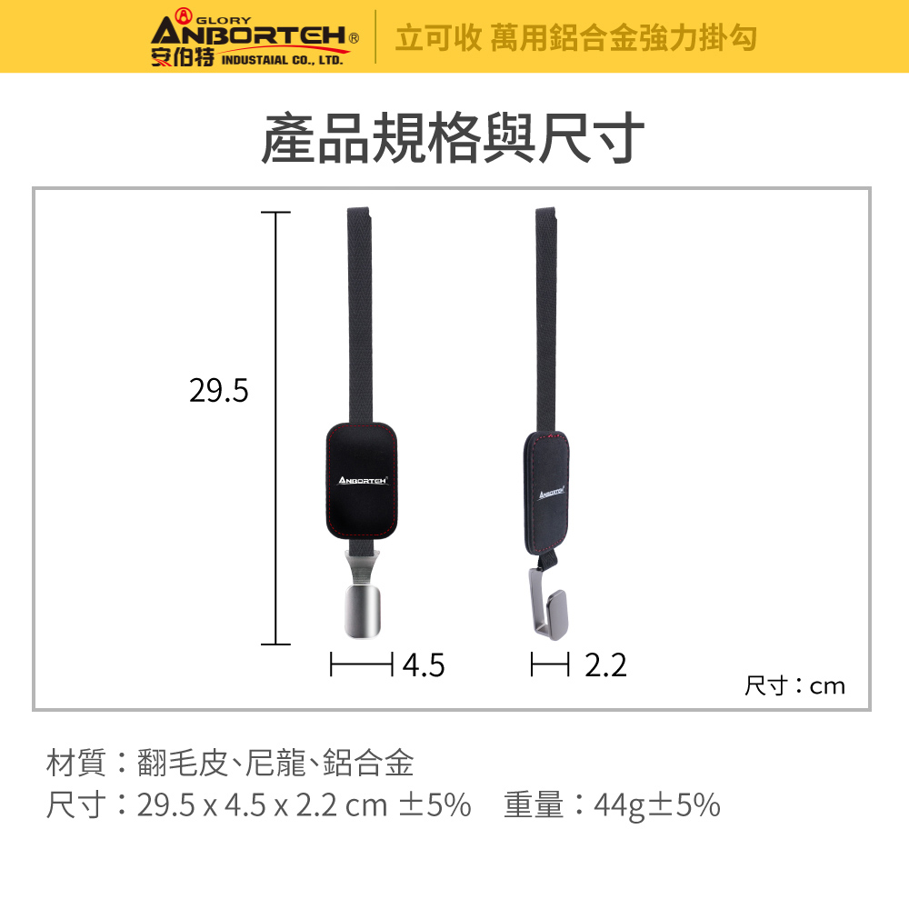 商品規格品名:【安伯特】萬用鋁合金強力掛勾型號:ABT-A152材質:翻毛皮、尼龍、鋁合金尺寸:29.5x4.5x2.2cm ±5%重量:44g ±5%保固範圍:新品暇疵產地:中國(台灣監造)