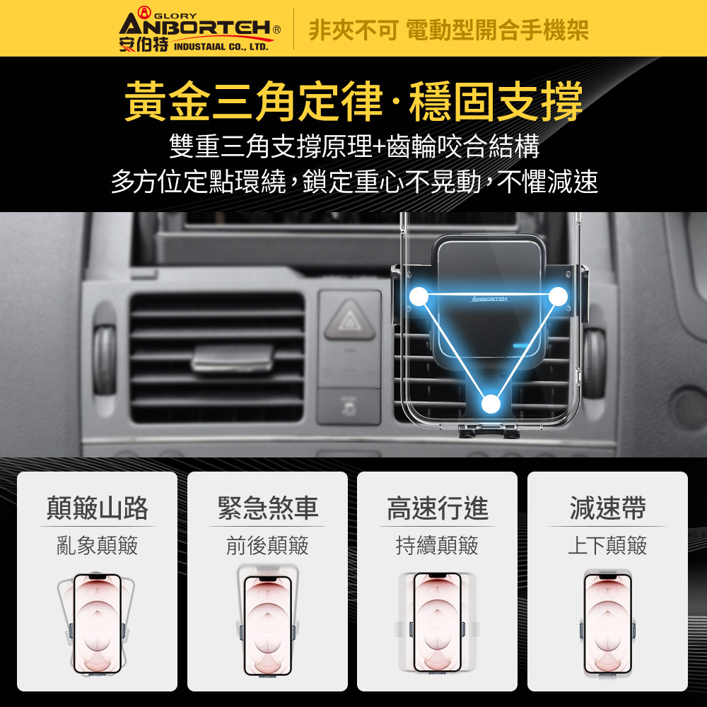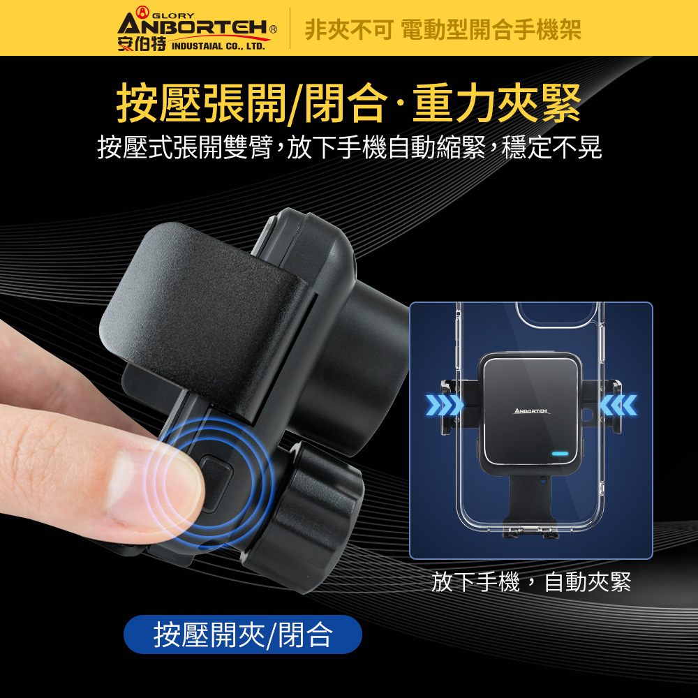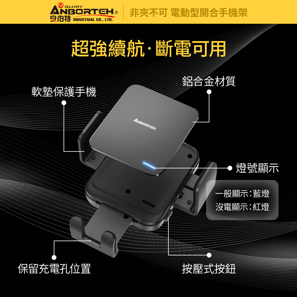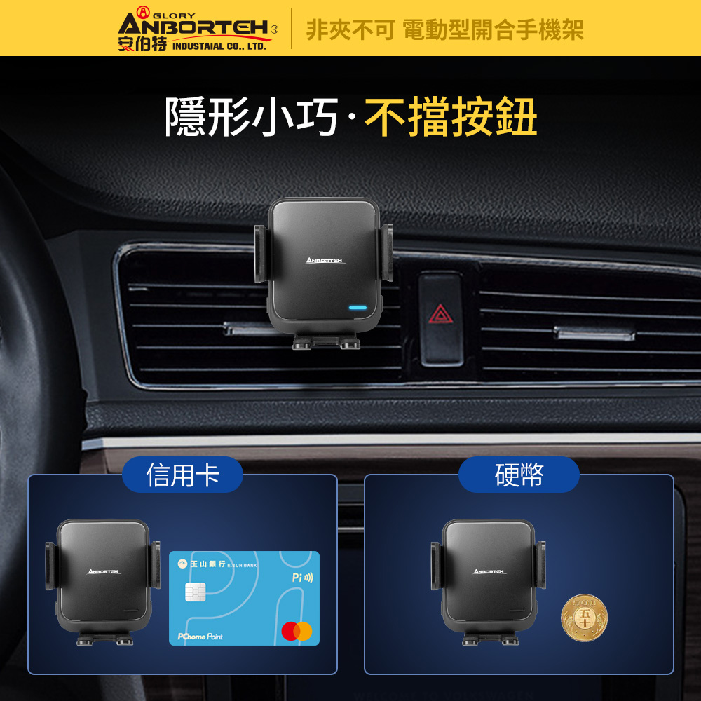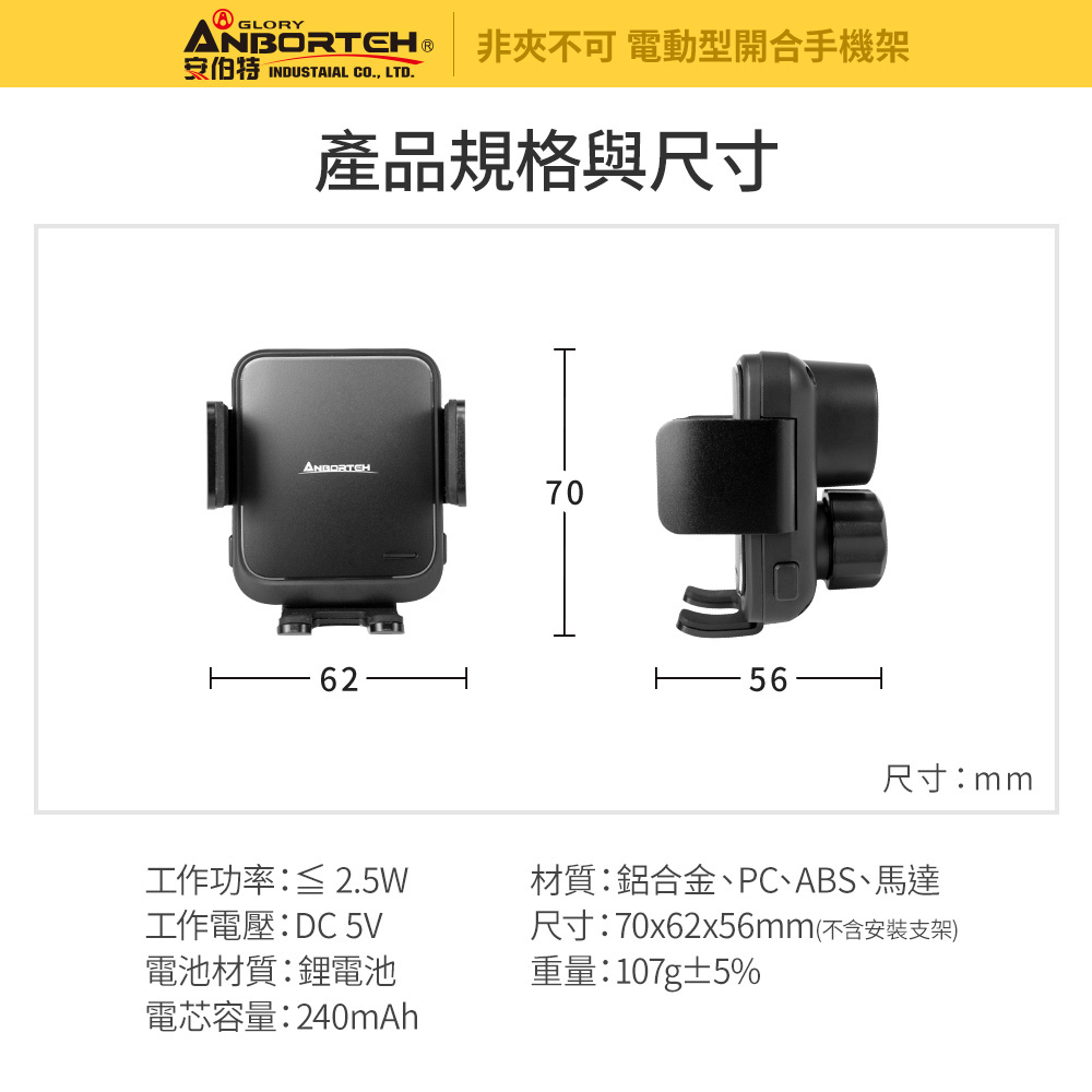 商品規格商品品名:【安伯特】電動型開合 車用手機架商品型號:ABT-A156工作功率:≦ 2.5W工作電壓:DC 5V工作電流:0.5A電池材質:鋰電池電芯容量:240mAh商品重量:107g ±5%商品材質:鋁合金、PC、ABS、馬達收合尺寸:70x62x56mm ±5% (不含安裝支架)張開尺寸:95x93x56mm ±5% (不含安裝支架)可支援手機寬度:84mm ±5%保固範圍:新品暇疵商品產地:中國(台灣監造)