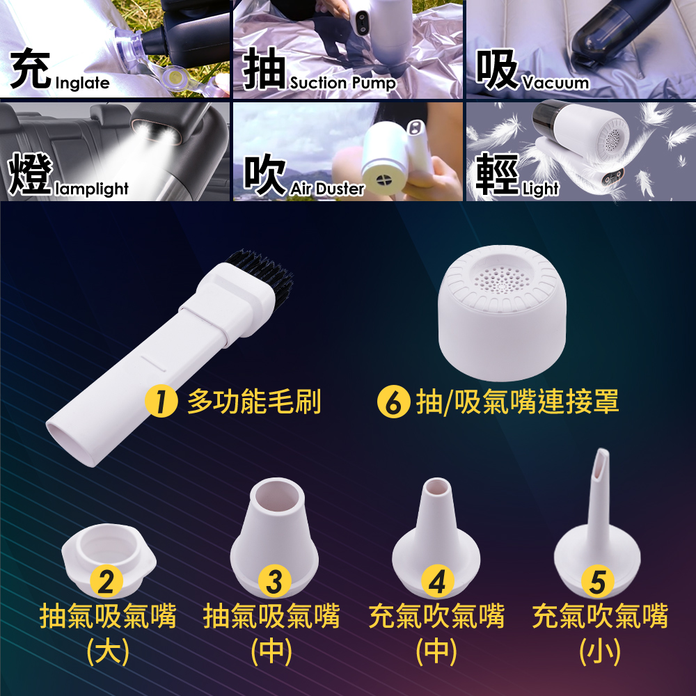 吸塵 : 各種灰塵通通搞定充氣 : 游泳圈充氣等戶外用具吹風 : 可吹走灰塵、細削抽氣 : 收納壓縮、真空壓縮照明 : 雙LED照明設計輕量 : 352g單手好拿不費力