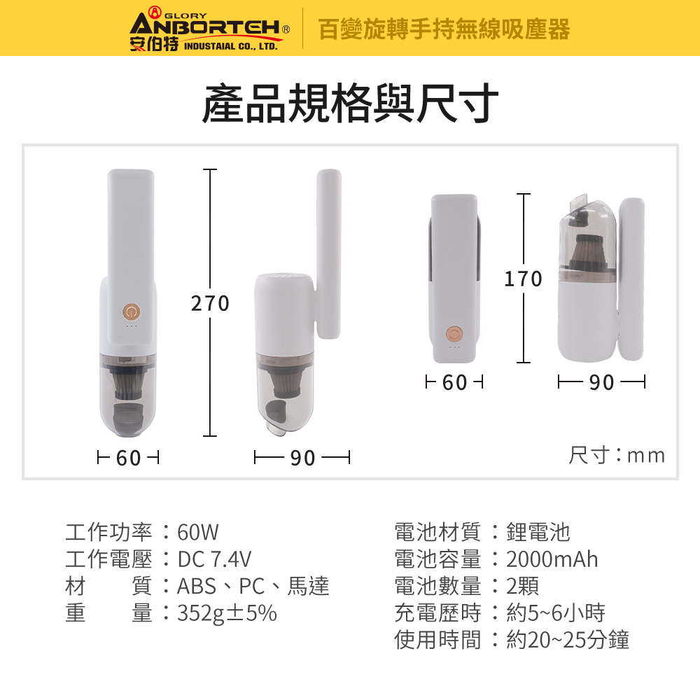 商品規格商品品名:【安伯特】百變旋轉手持無線 車用吸塵器商品型號:ABT-D005商檢字號:R3D197工作功率:60W工作電壓:DC 7.4V電池材質:鋰電池電池容量:2000mAh電池數量:2顆商品材質:ABS、PC、馬達 充電歷時:約5~6小時使用時間:約20~25分鐘展開尺寸:270x60x90mm ±5%收合尺寸:170x60x90mm ±5%商品重量:352g ±5%保固範圍:新品暇疵保存期限:主體保固一年(非人為因素下)商品產地:中國(台灣監造)