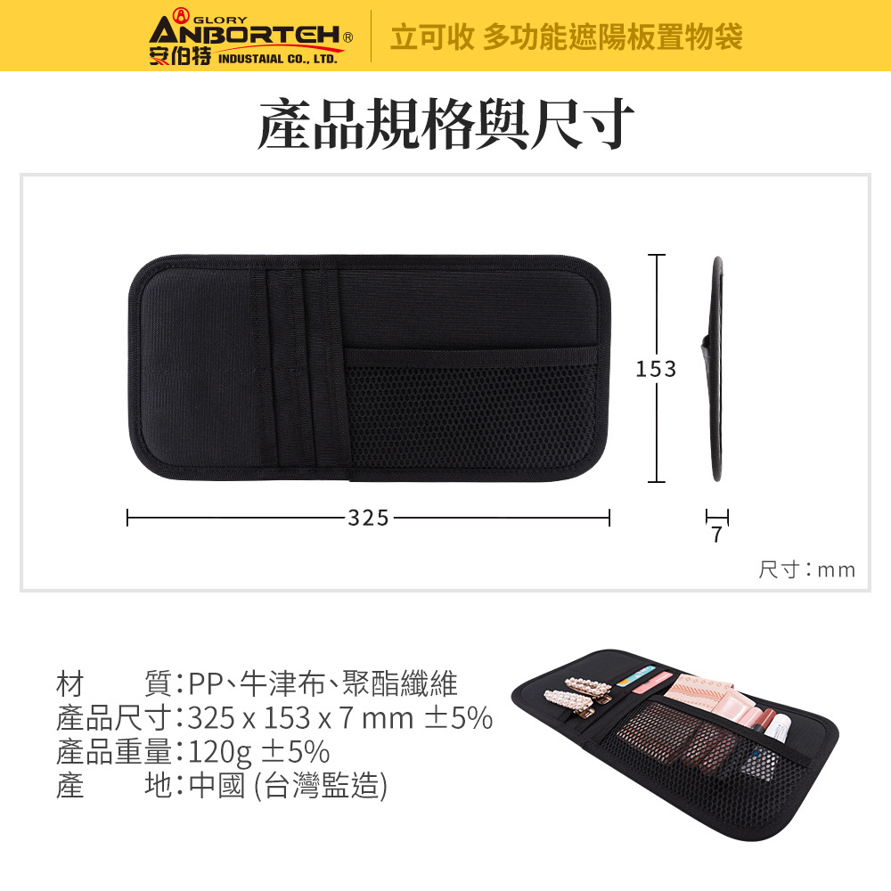 商品規格品名:【安伯特】立可收 多功能遮陽置物板型號:ABT-A109材質:PP、牛津布、聚酯纖維尺寸:325x153x7mm ±5%重量:120g ±5%保固範圍:新品暇疵產地:中國(台灣監造)
