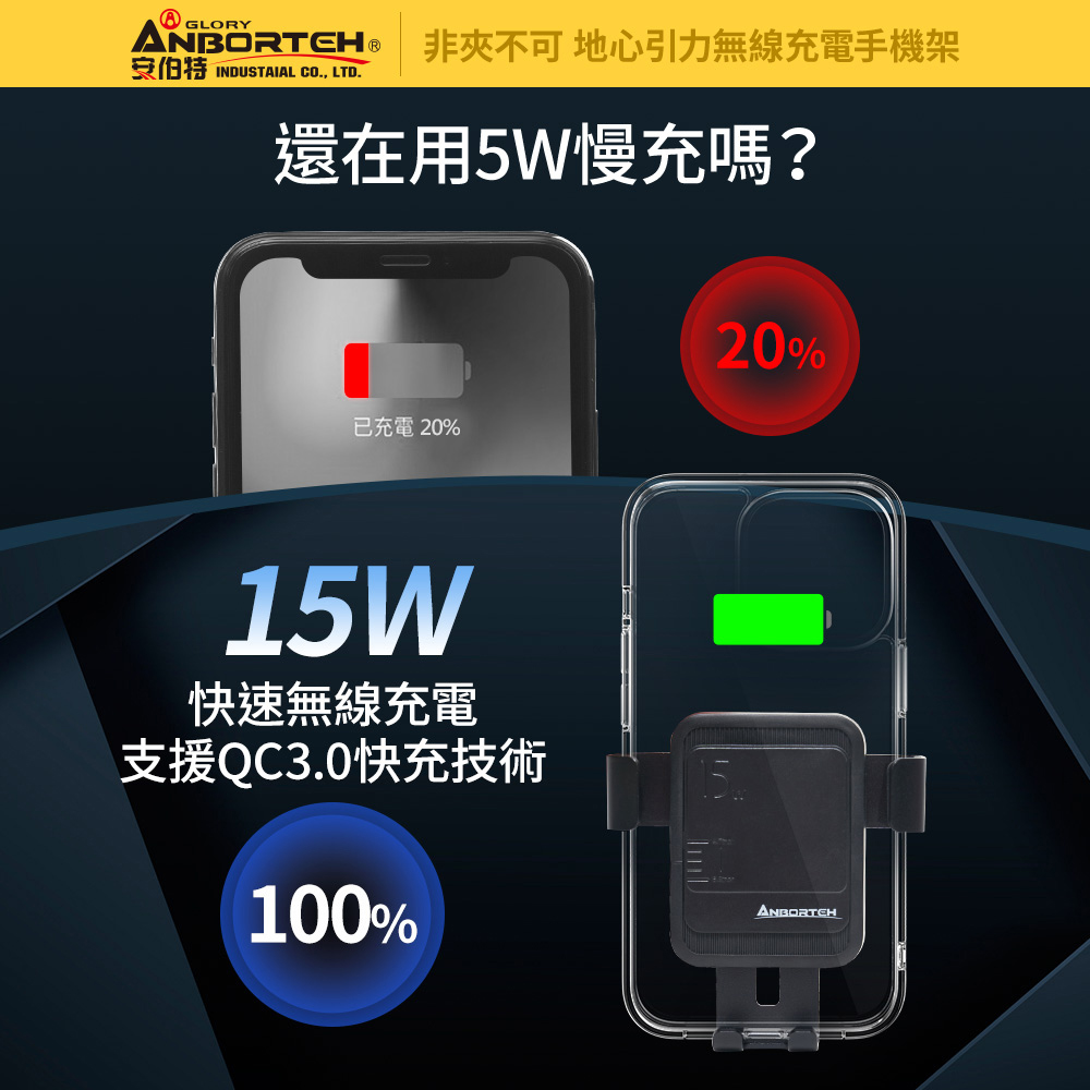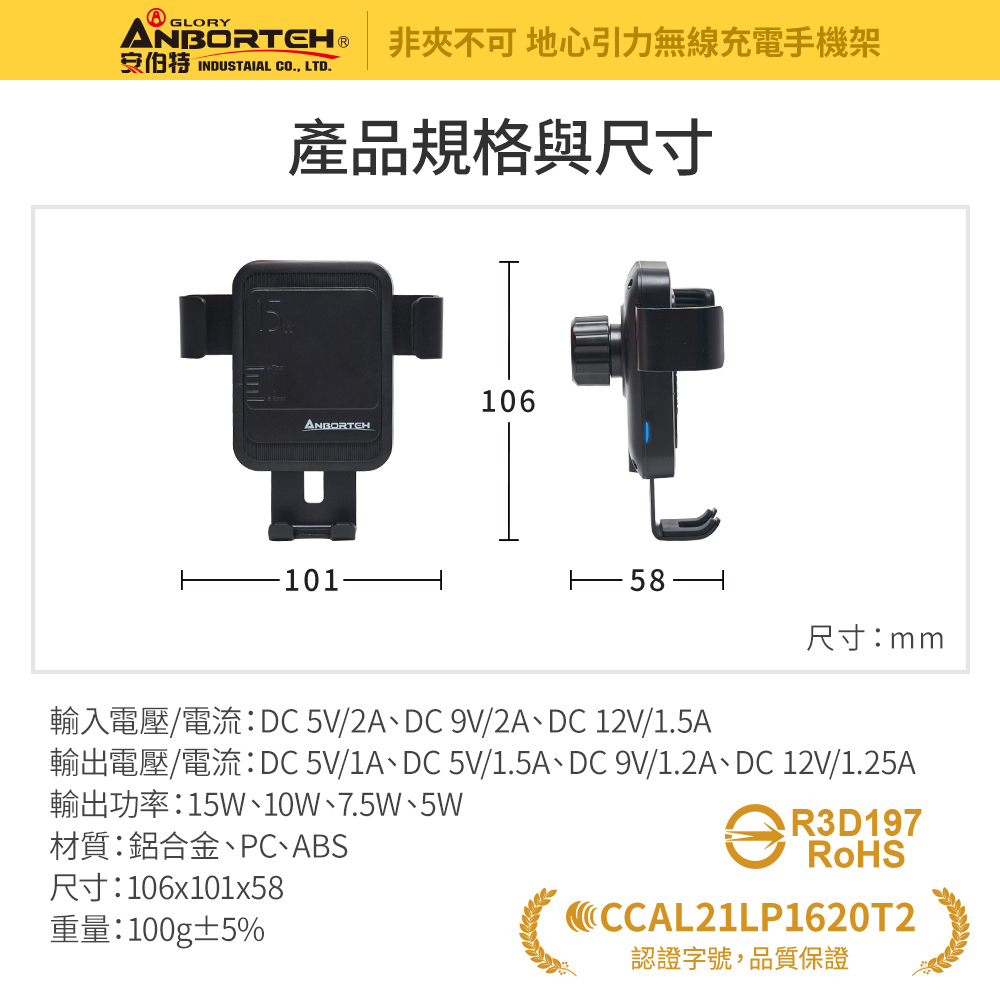 商品規格商品品名:【安伯特】地心引力無線充電手機架商品型號:ABT-A078輸入電壓/電流:DC 5V/2A、DC 9V/2A、DC 12V/1.5A輸出電壓/電流:DC 5V/1A、DC 5V/1.5A、DC 9V/1.2A、DC 12V/1.25A輸出功率:15W、10W、7.5W、5W商品材質:鋁合金、PC、ABS商品尺寸:106x101x58mm ±5%商品重量:100g ±5%支援手機寬度:86mm ±5%閉合尺寸:116x79x58mm ±5% (不含安裝支架)張合尺寸:106x101x58mm ±5% (不含安裝支架)BSMI:R3D197NCC:CCAL21LP1620T2保固範圍:新品暇疵商品產地:中國(台灣監造)