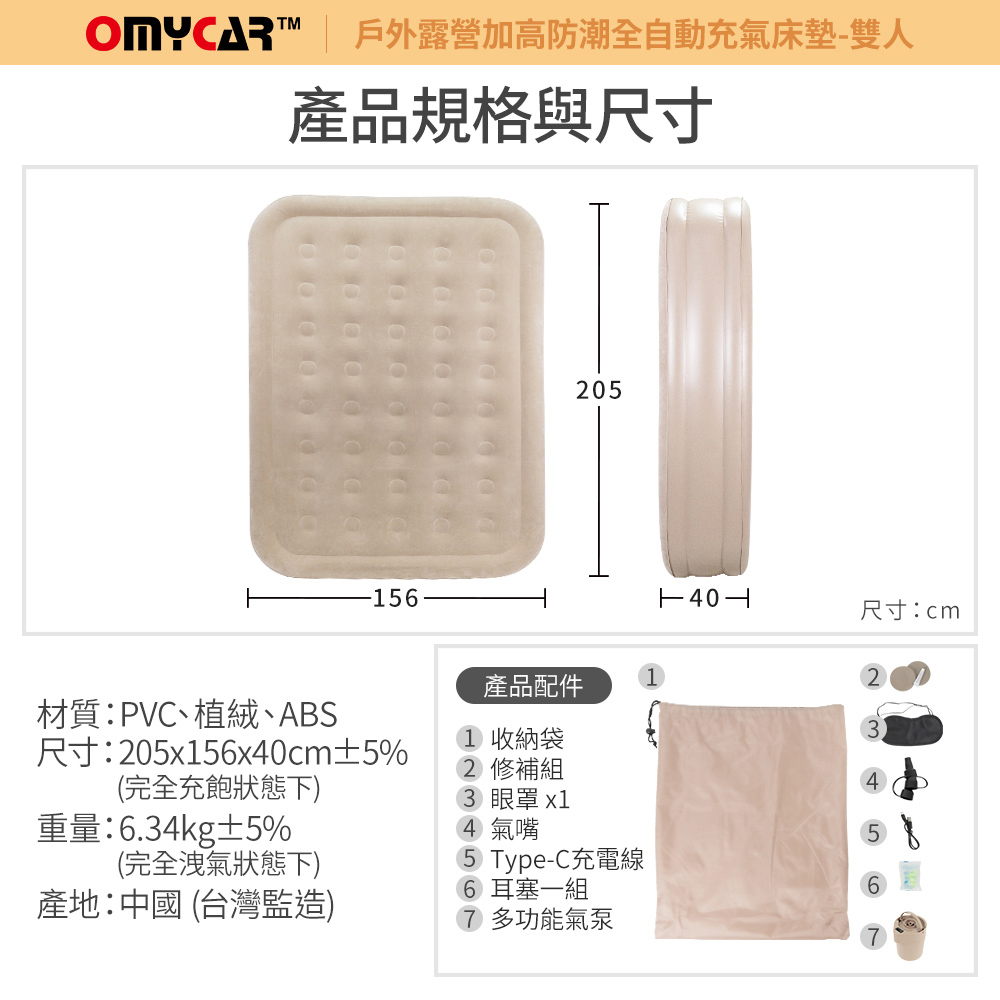 商品規格商品品名:【OMyCar】加高全自動充氣床墊-雙人商品材質:PVC、植絨、ABS展開尺寸:205x156x40cm ±5% (完全充飽狀態下)收納尺寸:48x33x15cm ±5%商品重量:6.34kg ±5% (完全洩氣狀態下)保固範圍:新品暇疵保固期限:1年(保固範圍-正常使用下/非人為因素)商品產地:中國(台灣監造)