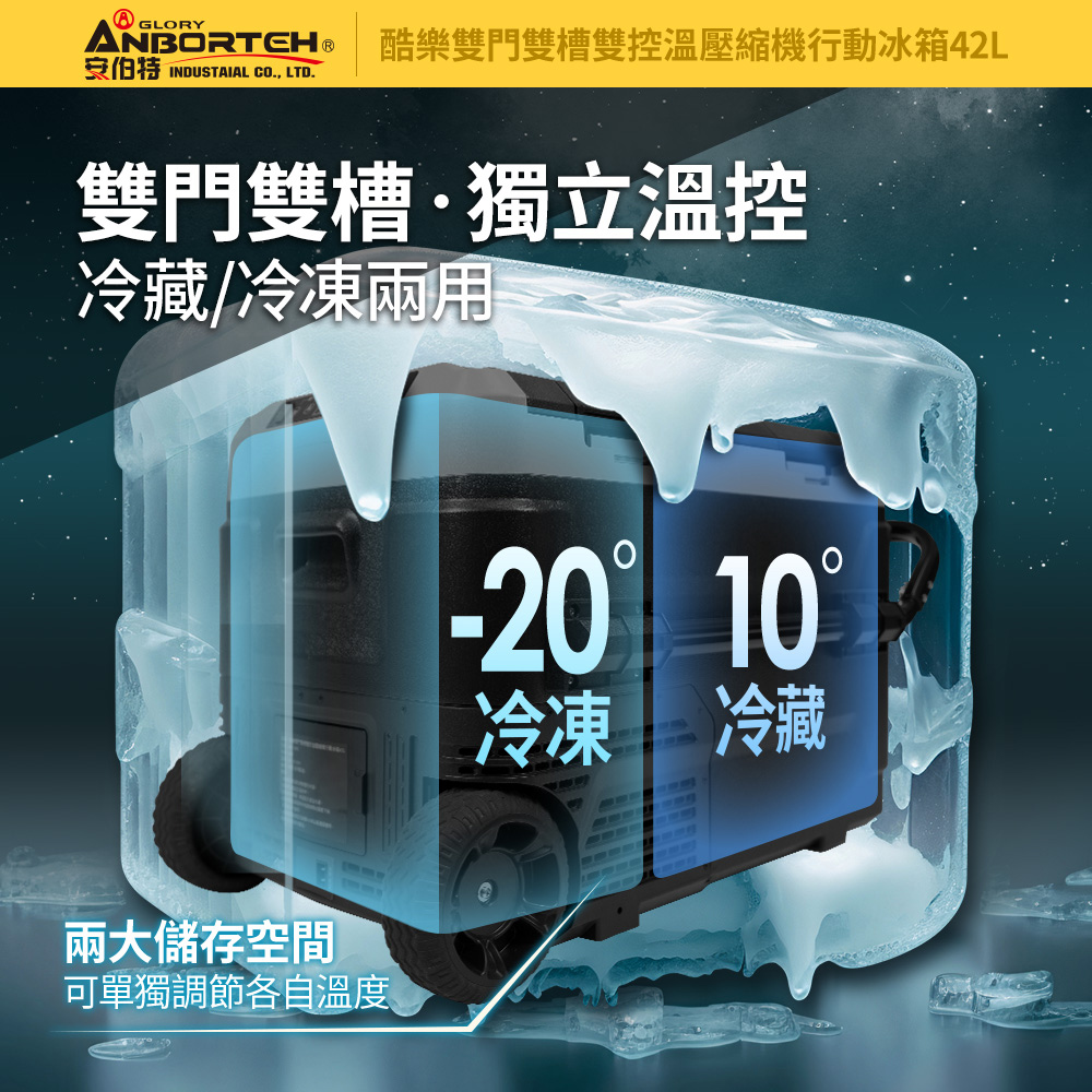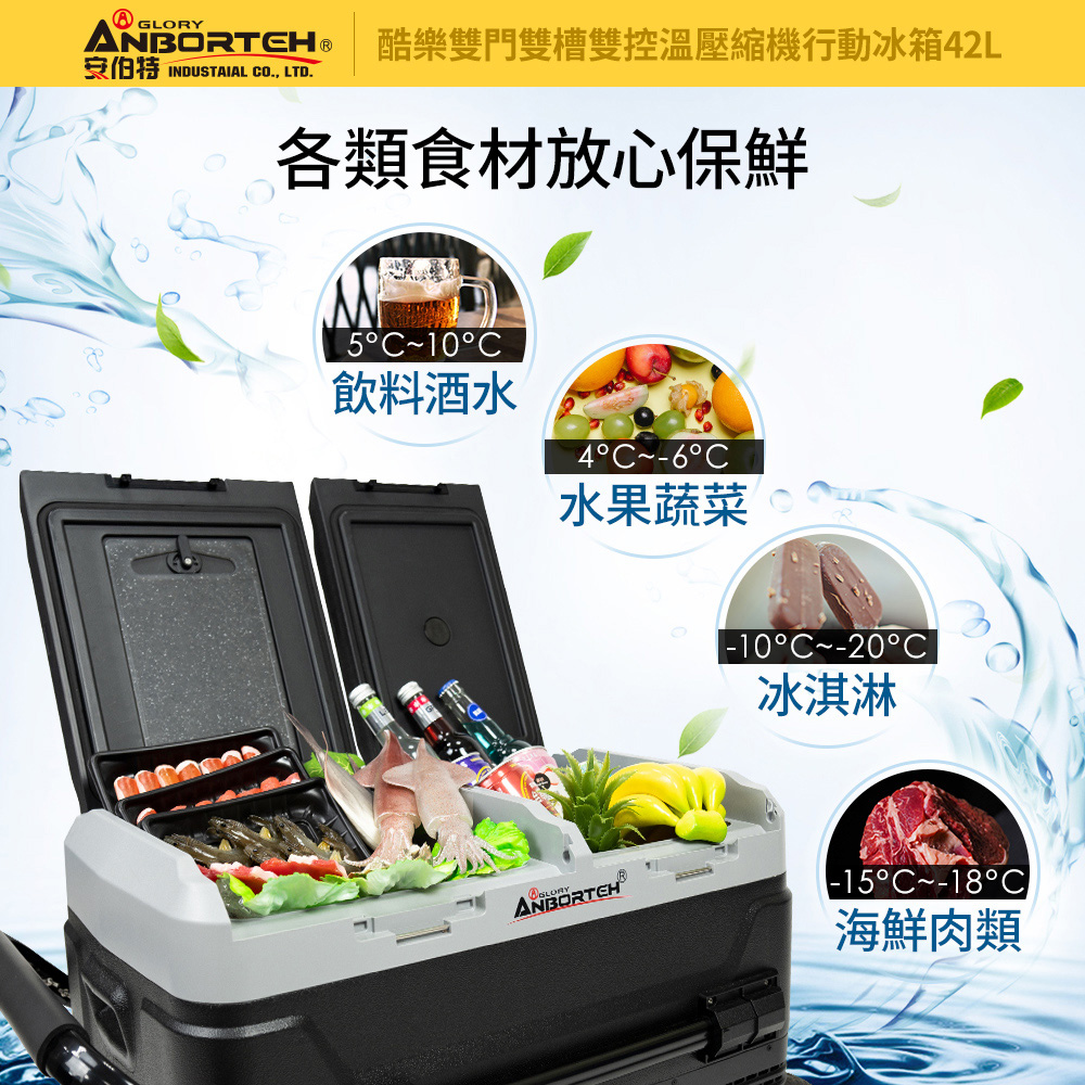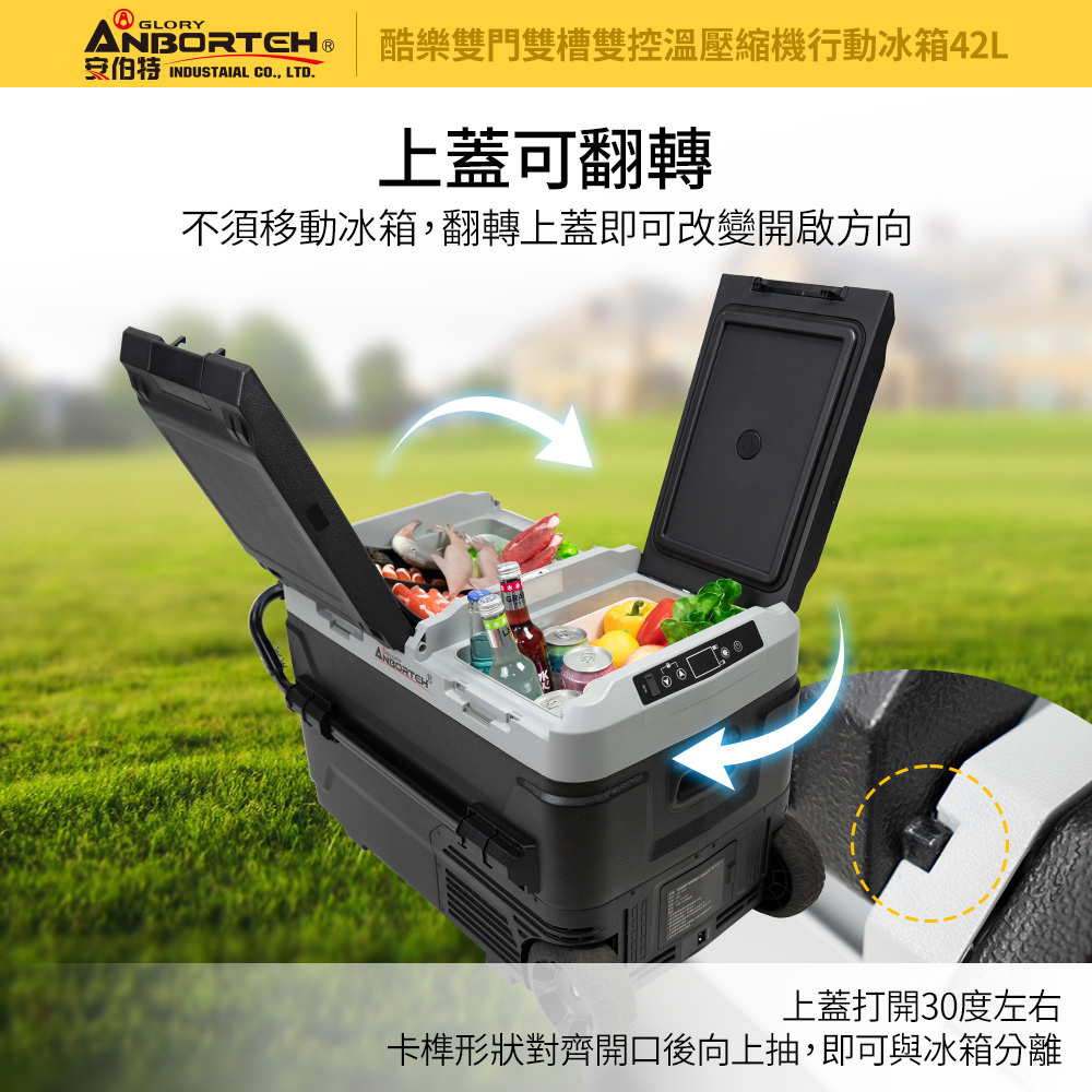 【安伯特】酷樂壓縮機行動冰箱42L雙門、雙槽、雙控溫、雙向開蓋設計不論是露營/外出/郊遊/野餐一台搞定隨時隨地為你保留最新鮮的!