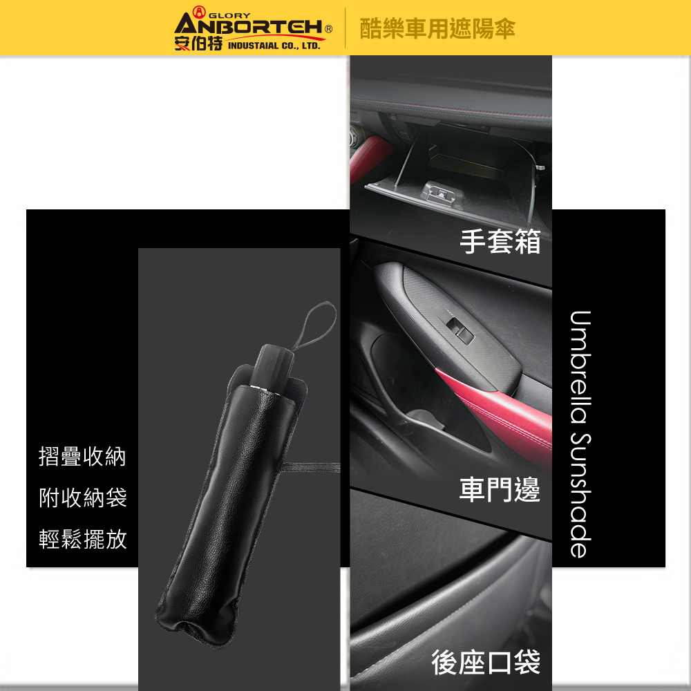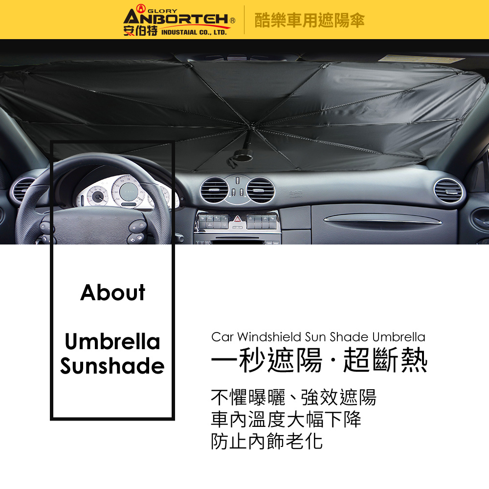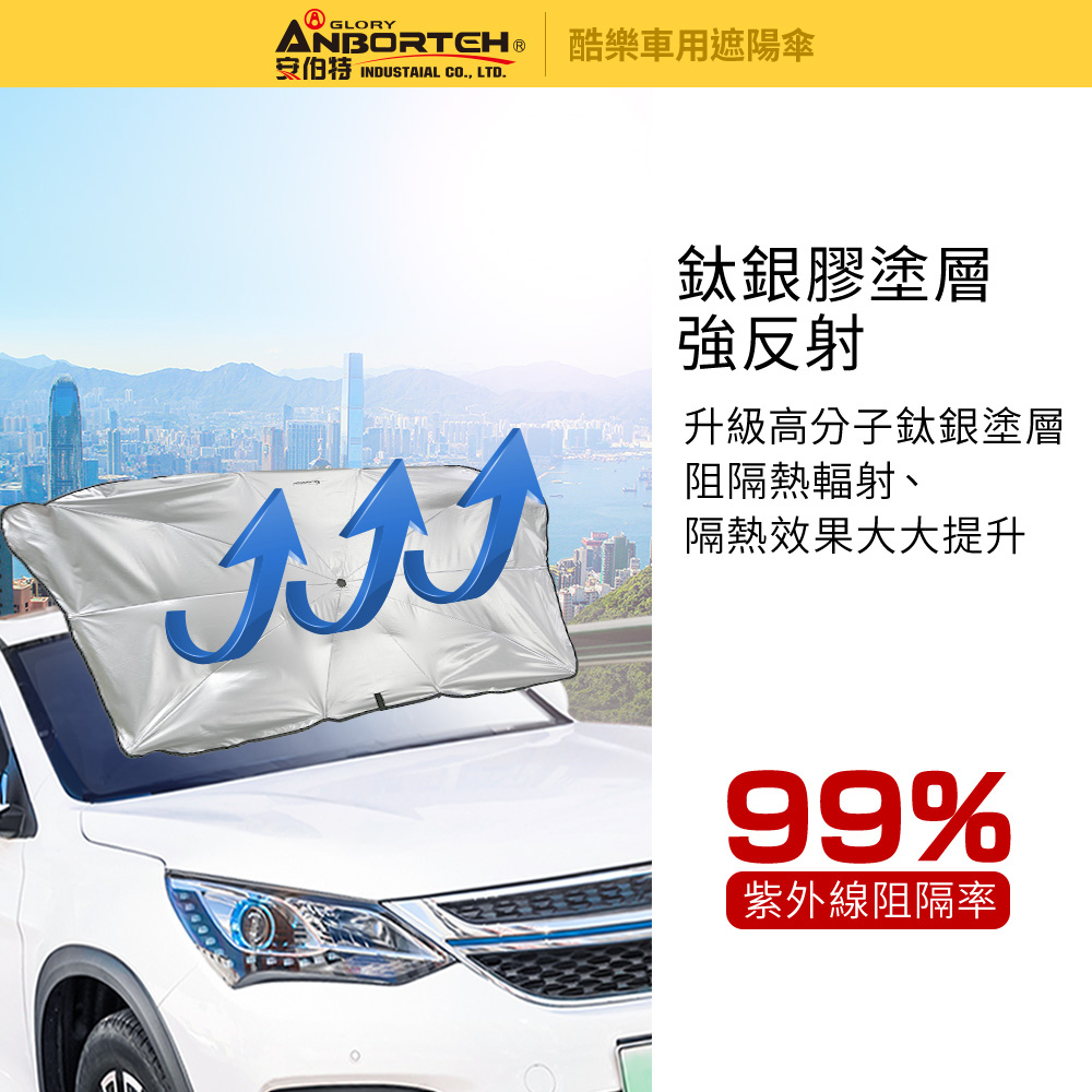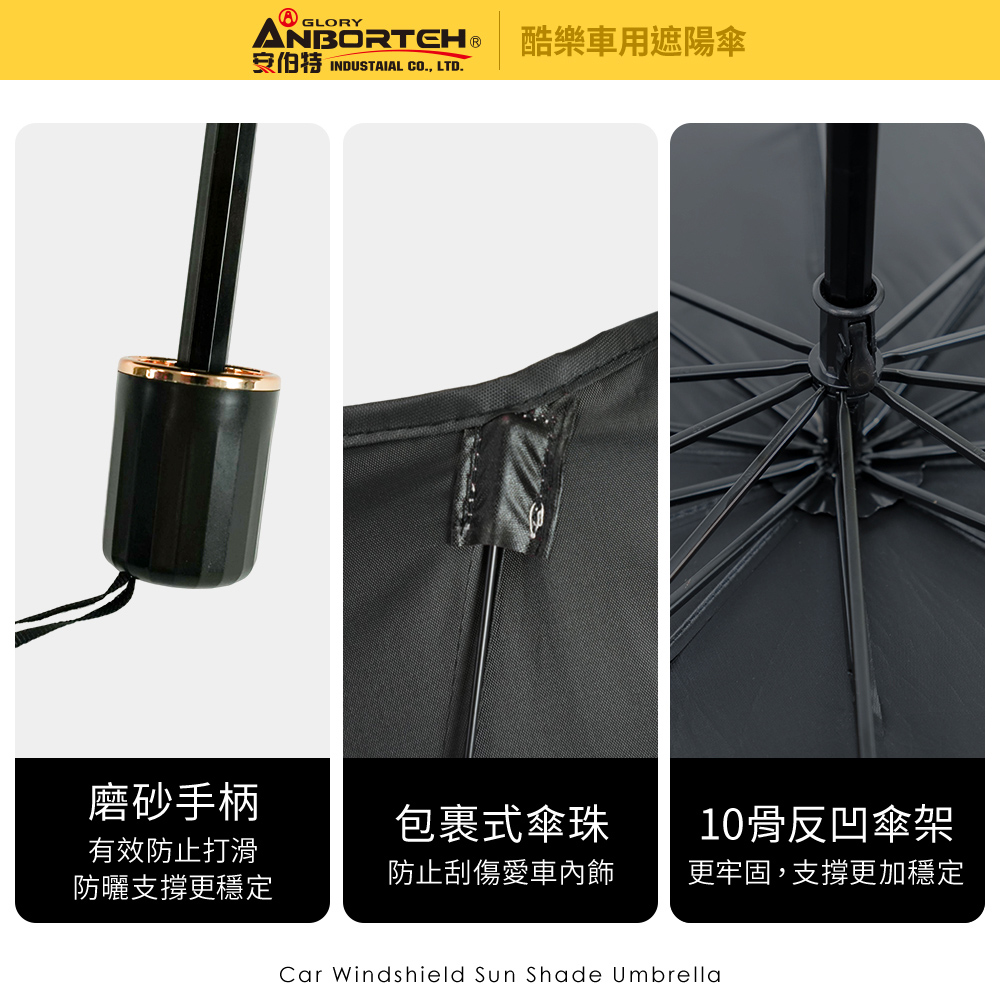 傘式設計 : 單人輕鬆使用,快速開合收納反凹傘架 : 10骨反凹傘架,支撐穩定牢固遮陽防曬 : 鈦銀膠塗層,阻隔99%紫外線磨砂手柄 : 有效防止打滑,支撐更穩固預防老化 : 延長車內飾物使用壽命收納方便 : 附贈收納皮套,輕鬆收納適用範圍 : 通用性高,適用95%以上車款