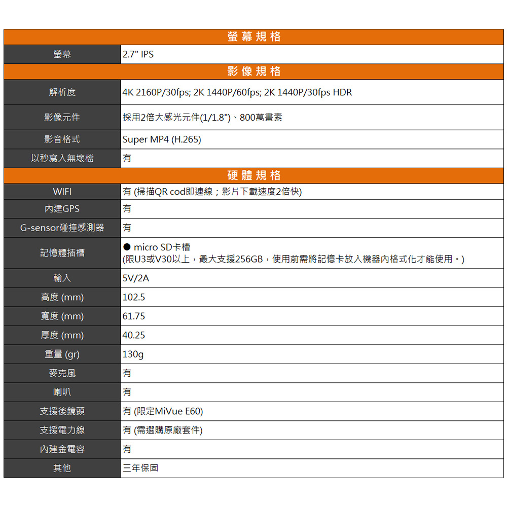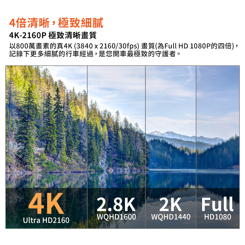▲4K-2160P,極致清晰畫質▲頂級夜拍能力,主機 2 倍大感光元件▲內建高速WIFI無線更新測速點,影片下載速度2倍快▲安全預警六合一▲支援指定 2K 後鏡頭 E60▲專利動態固定測速預警▲動態區間測速預警▲科技執法預警▲可轉向固定測速預警▲移動測速定點預警▲高架固定測速預警▲內建超級金電容▲聲控語音指令▲SuperMP4 格式,以秒寫入無壞檔▲智能二合一駐車模式(全時/省電)需選購電力線
