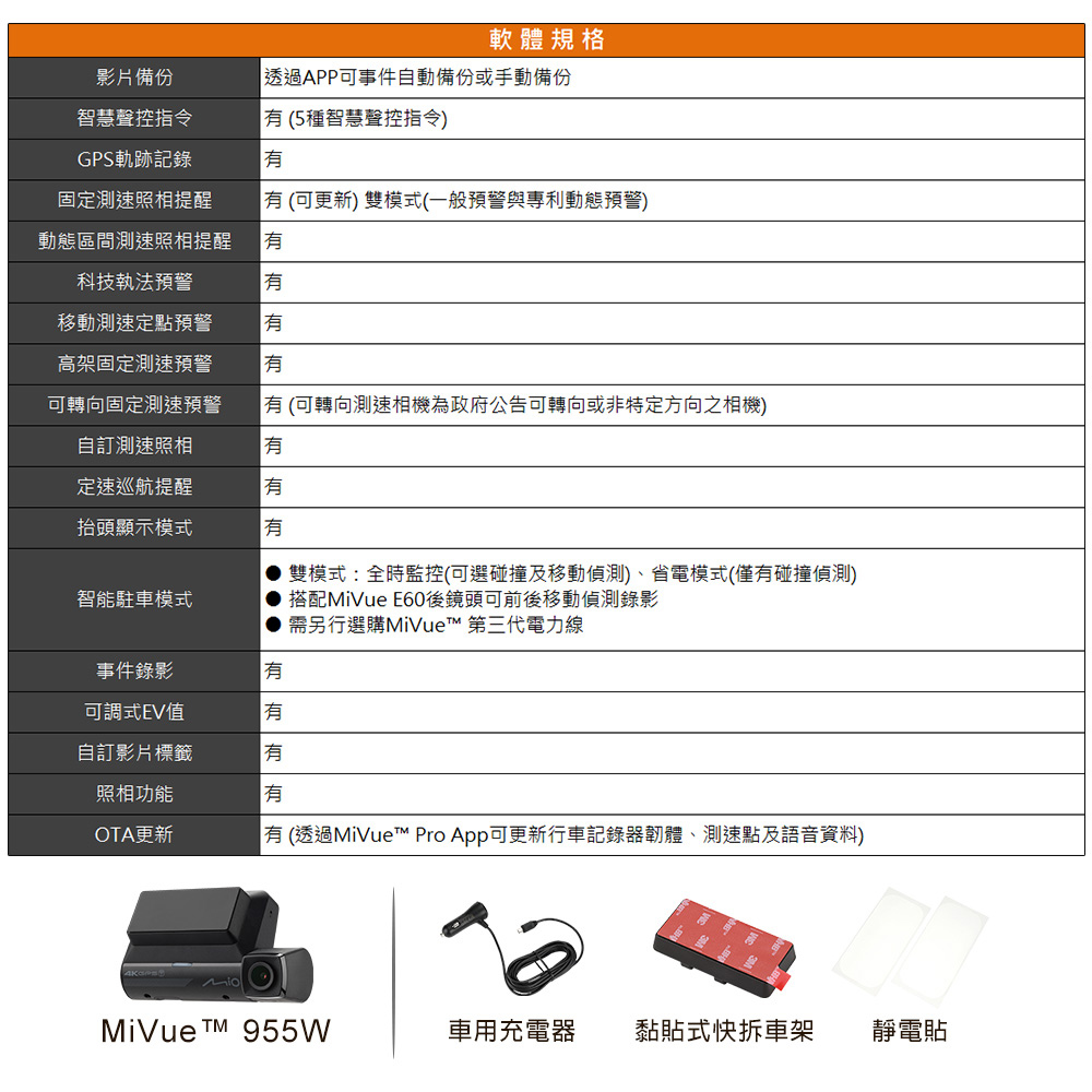 商品規格品名:Mio 955W 行車記錄器BSMI字號:R45630機身尺寸:102.5x61.75x40.25mm ±5%主機重量:130g ±5%保固範圍:新品暇疵保固期限:原廠主機保固3年,配件三個月產地:中國 材積:103*62*41mm----------------------------------------------------------------------------◆Mio 客服專線 (台灣區)客服專線 :(03)318-8168 ◆服務時間 星期一至星期五 09:00 AM – 12:00PM01:00 PM – 06:00 PM注意: 下列規格若有變更,恕不另行通知。同一產品之規格、功能及其上提供之服務將因銷售地區之不同而異,實際內容請以購買當地機種為準。 (如有問題請洽 Mio 客服專線)