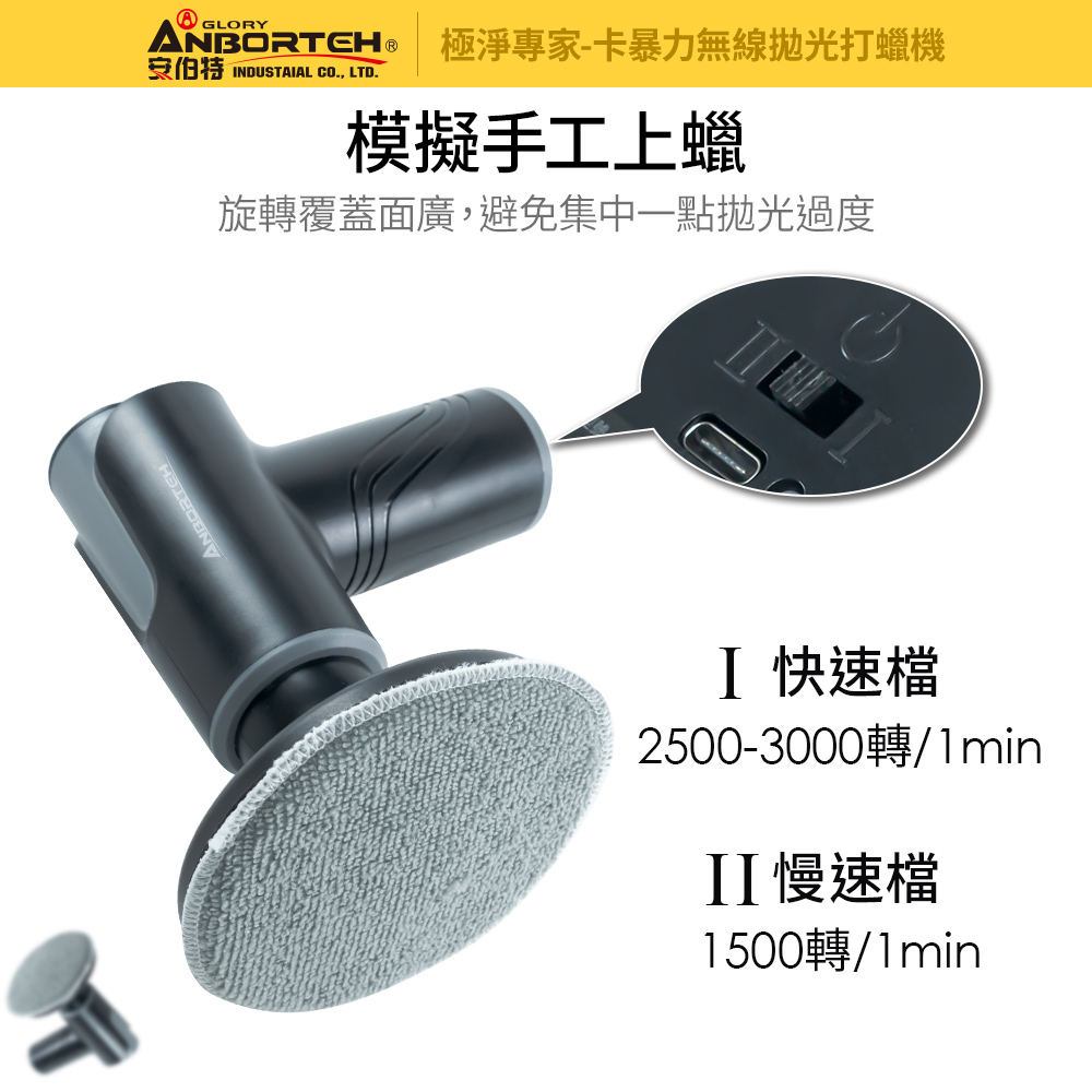 【安伯特】卡暴力 無線拋光打蠟機 推薦功能 :無線設計 : 沒有線材束縛,使用無拘束輕量設計 : 僅328g,單手好拿不費力2 檔調速 : 快速檔、慢速檔,滿足不同需求防震握柄 : 強勁動力,不手麻多款配件 : 多種打蠟盤可隨意替換機身輕巧 : 小巧便攜,不占空間