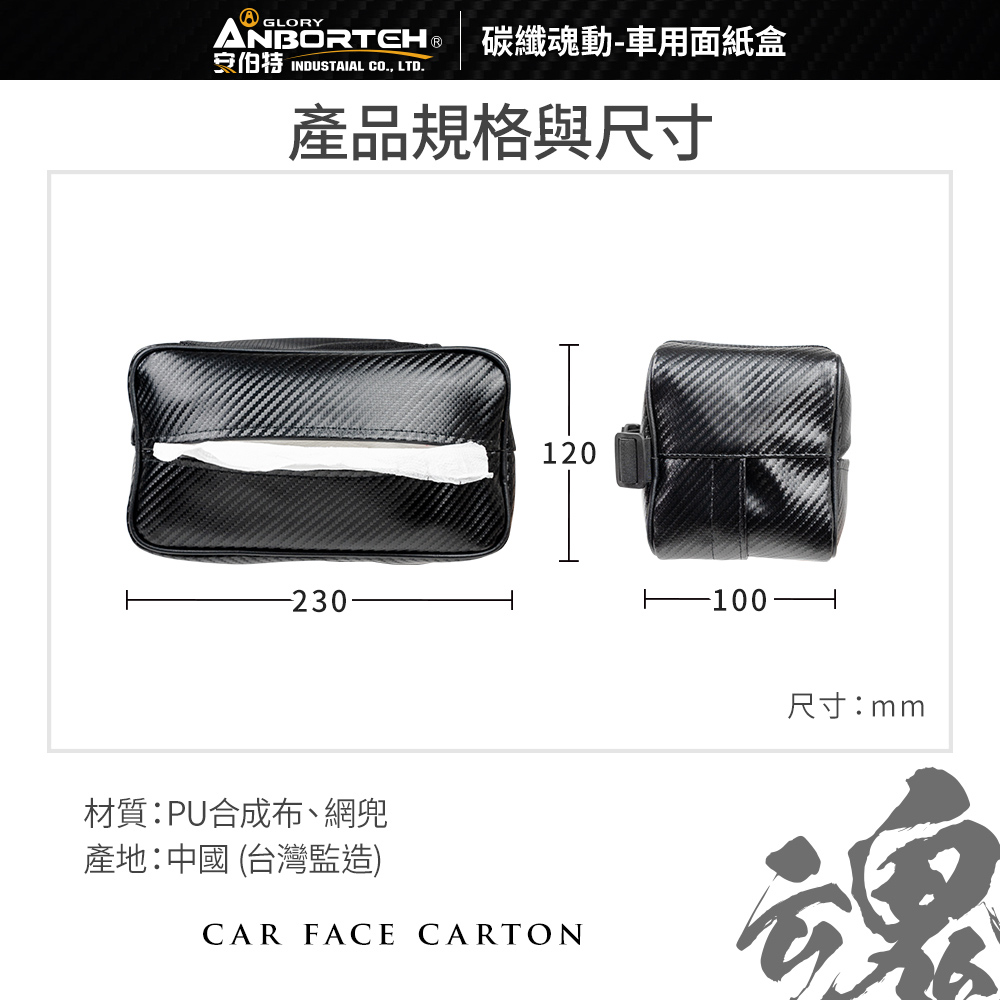 商品規格品名:【安伯特】碳纖魂動 車用面紙盒型號:ABT-A122材質:PU合成布、網兜尺寸:230x120x100mm ±5%重量:135g ±5%保固範圍:新品暇疵產地:中國(台灣監造)
