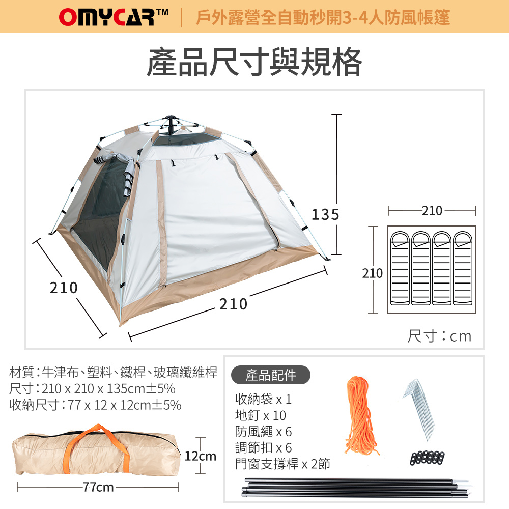 商品規格品名:【OMyCar】戶外露營全自動秒開帳材質:牛津布、塑料、鐵桿、玻璃纖維桿尺寸:210x210x135cm ±5%收納尺寸:77x12x12cm ±5%重量:3500g ±5%保固範圍:新品暇疵產地:中國(台灣監造)