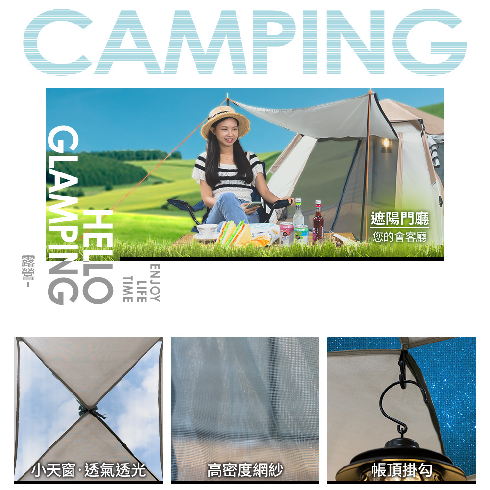 快速開帳 : 3秒開帳,一人即可輕鬆搭設超大空間 : 3-4人睡眠模式,5-6人休憩模式天窗設計 : 頂蓋可拆卸,通風透氣又可防曬防雨雙門雙窗 : 雙門雙窗+小天窗,透光透氣帳頂掛勾 : 可懸掛露營燈,方便實用細密網紗 : 高密度網紗,透氣防蚊蟲