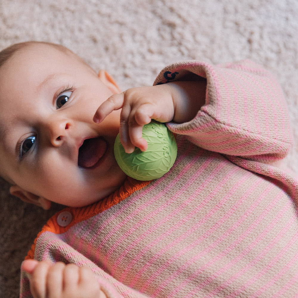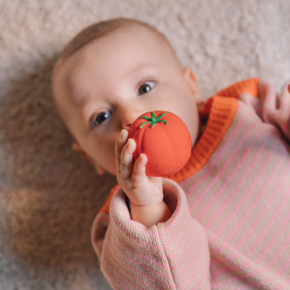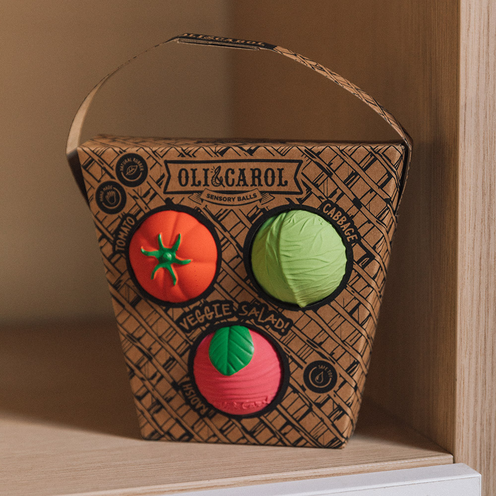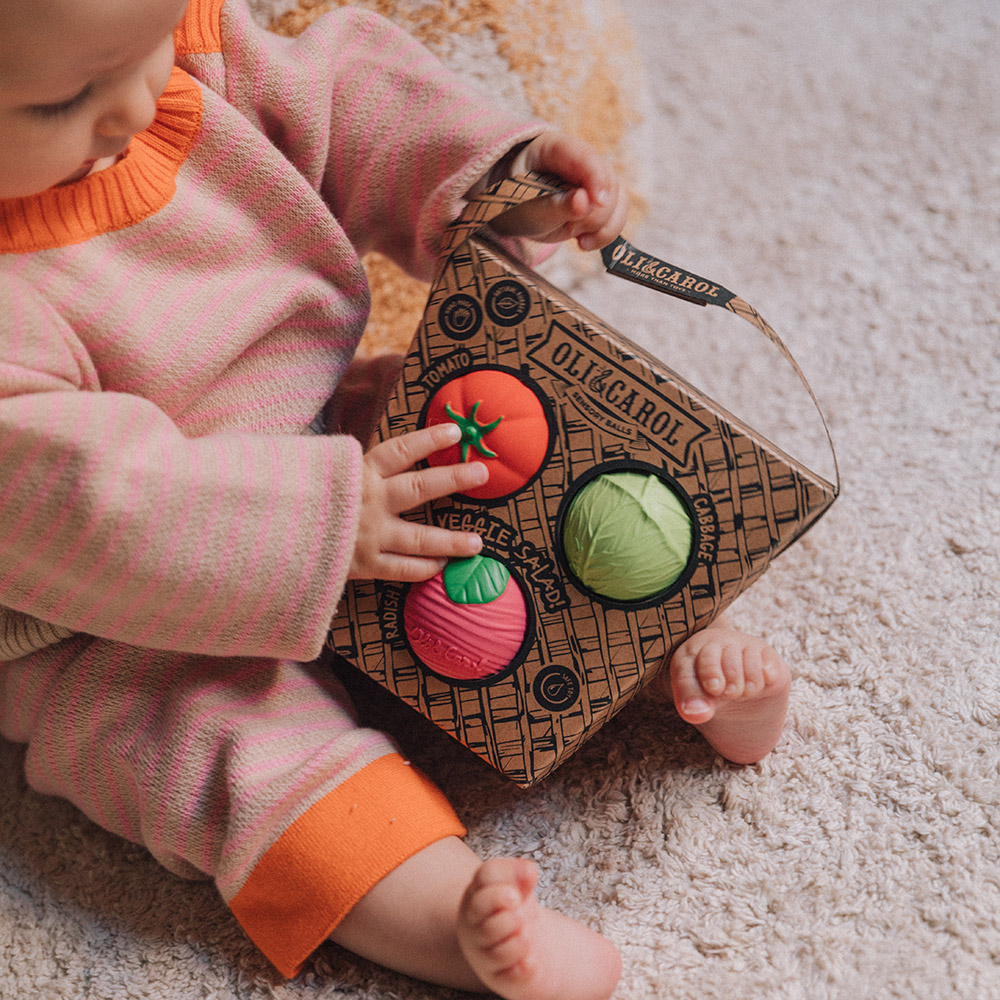 球體尺寸專為小手設計,這些亮眼的蔬菜能激發感官探索,適合抓握、啃咬及彈跳等各種遊戲方式。