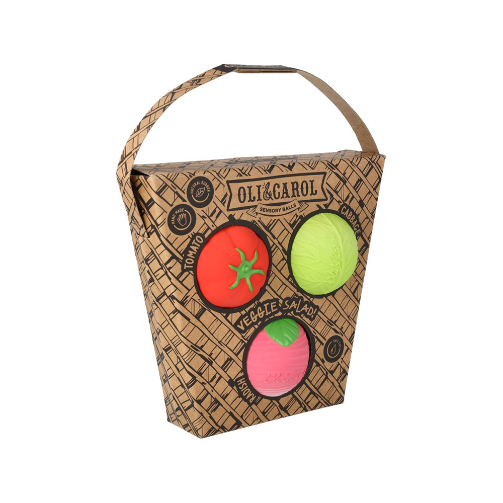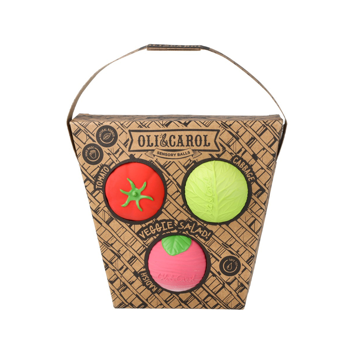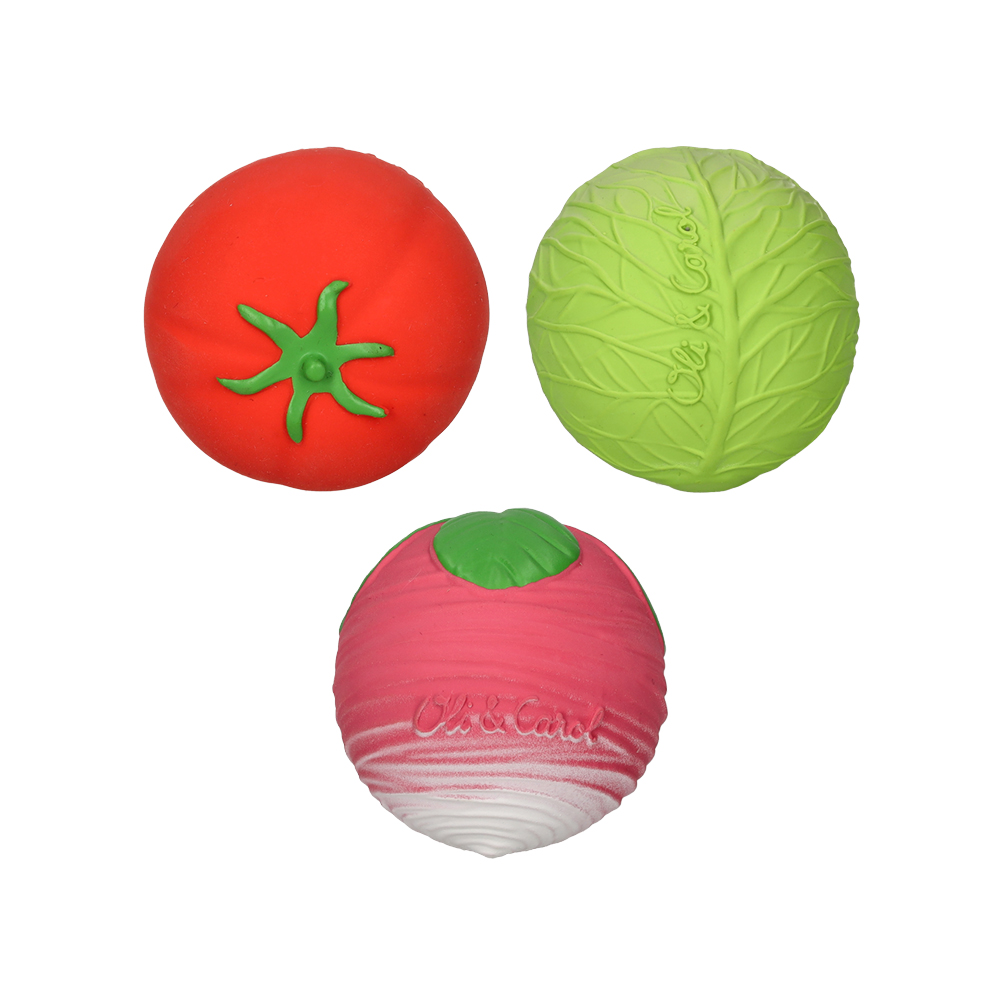 新鮮到貨!蔬菜沙拉乳膠球組內含三顆造型觸感球:番茄、甘藍菜、櫻桃蘿蔔。