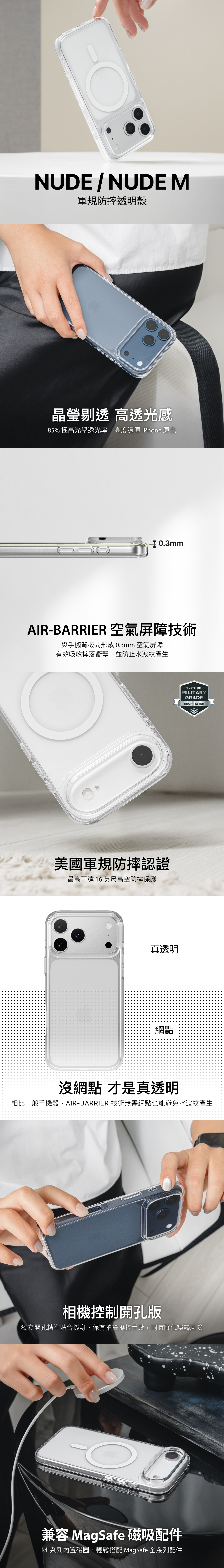 1. 晶瑩剔透 高透光感:85% 極高光學透光率,高度還原 iPhone 原色2. AIR-BARRIER 空氣屏障技術:與手機背板間形成 0.3mm 空氣屏障,有效吸收摔落衝擊,並防止水波紋產生3. 美國軍規防摔認證:最高可達 16 英尺高空防摔保護4. 沒網點 才是真透明:相比一般手機殼,AIR-BARRIER 技術無需網點也能避免水波紋產生5. 相機控制開孔版:獨立開孔精準貼合機身,保有拍攝操控手感,同時降低誤觸風險6. 兼容 MagSafe 磁吸配件:M 系列內置磁圈,輕鬆搭配 MagSafe 全系列配件