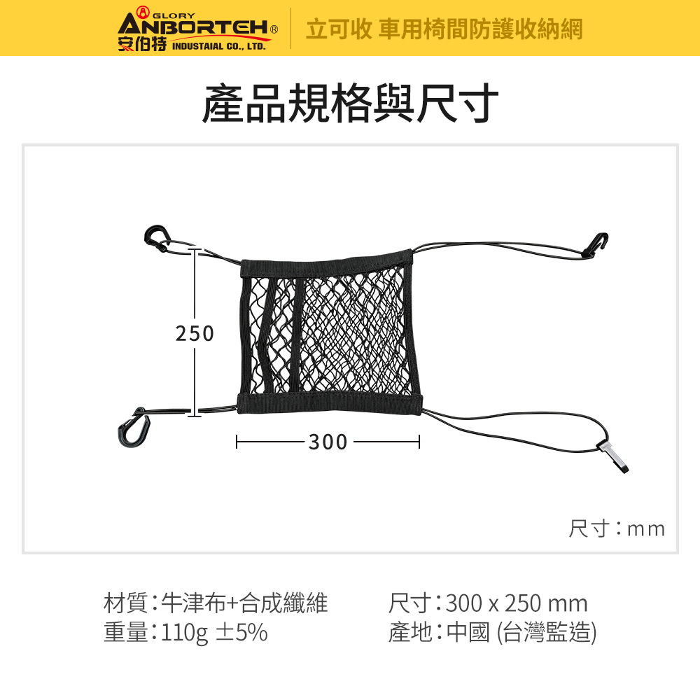 商品規格品名:【安伯特】車用椅間防護收納網料號:ABT-A115材質:牛津布+合成纖維尺寸:300x250mm ±5%重量:110g ±5%保固範圍:新品暇疵產地:中國(台灣監造)