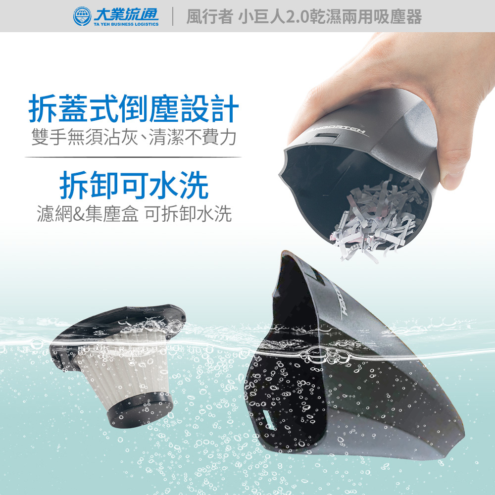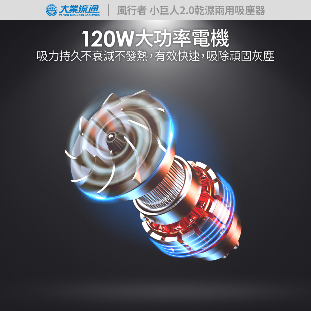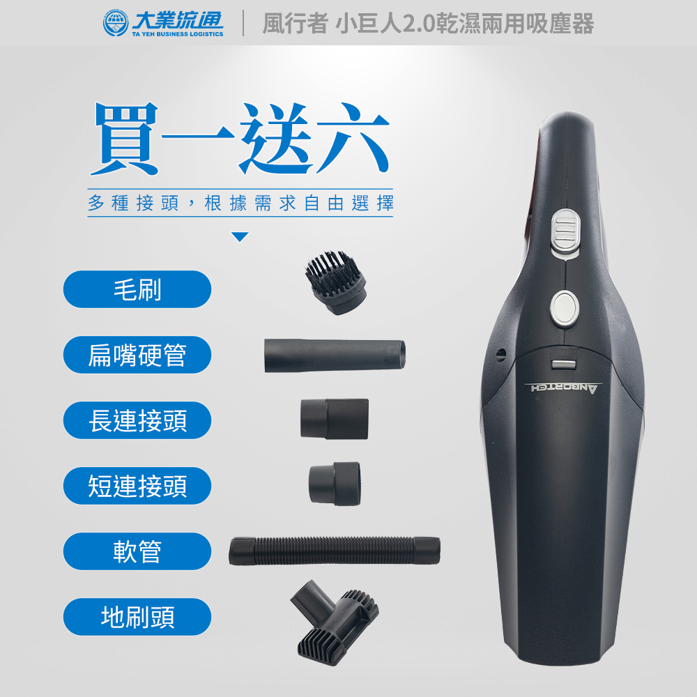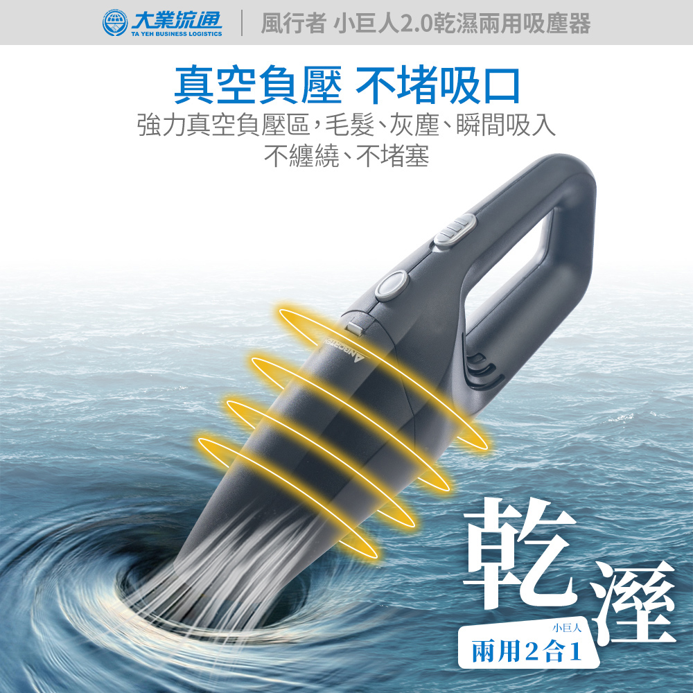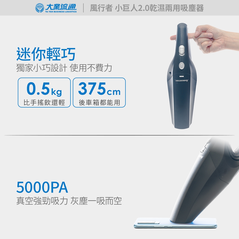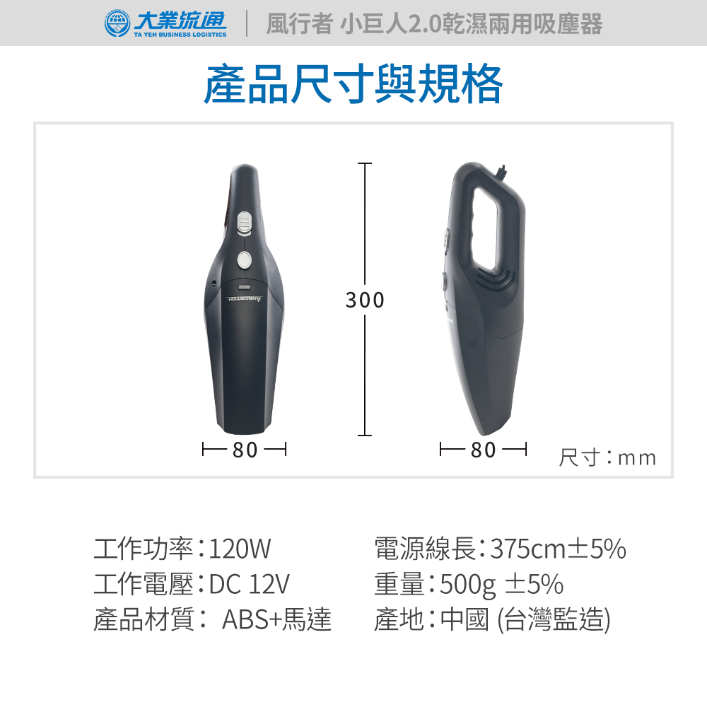 商品規格品名:小巨人2.0乾濕兩用 車用吸塵器料號:TA-E004工作功率:120W工作電壓:DC 12V電源線長:375cm ±5%材質:ABS+馬達尺寸:300x80x80mm ±5%重量:500g ±5%保固範圍:新品暇疵保固期限:主體保固六個月(非人為因素下)產地:中國(台灣監造)