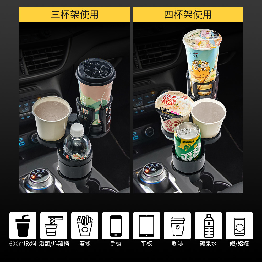 四合一 : 杯架擴充術,一分為四可擴張 : 底座擴張,根據杯槽大小調整可調節 : 杯架可伸縮調節,滿足不同需求可旋轉 : 360度旋轉式杯架免安裝 : 不需安裝,輕巧便攜緩衝墊 : 減少震動,穩固杯架防滑墊 : 防止滑動,避免左右搖晃