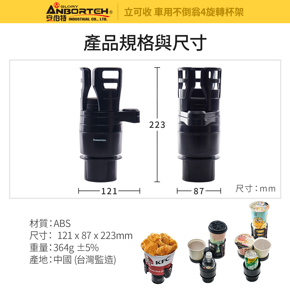 商品規格品名:【安伯特】車用不倒翁4旋轉杯架料號:ABT-A104材質:ABS尺寸:121x87x223mm ±5%重量:364g ±5%保固範圍:新品暇疵產地:中國(台灣監造)