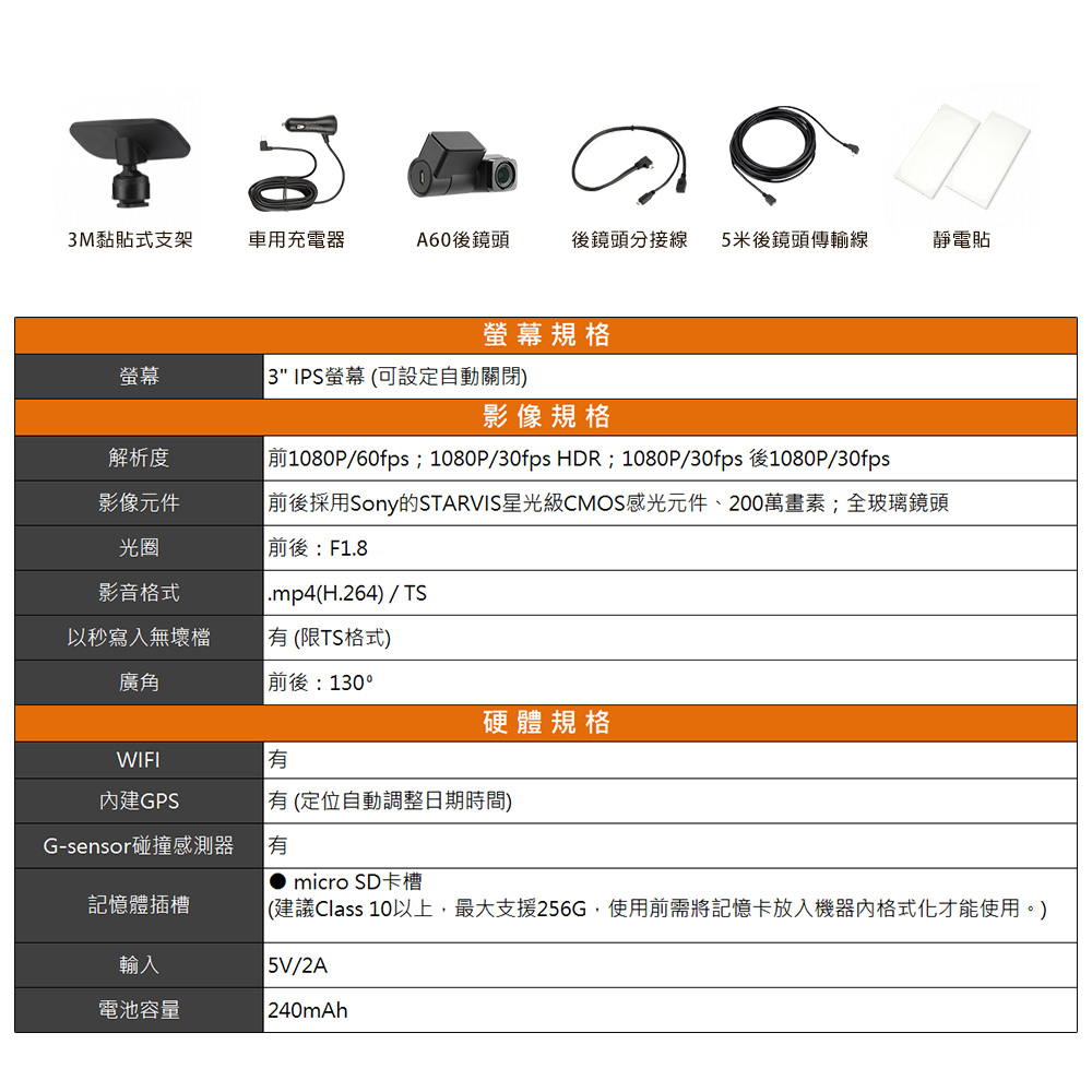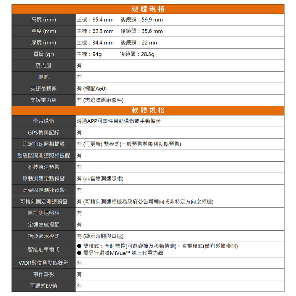 採用Sony的星光級感光元件前後 F1.8 大光圈內建WIFI聰明備份WIFI OTA無線更新測速點智能二合一駐車模式(停車監控)可選 TS 格式以秒寫入無壞檔 安全預警六合一(1)測速雙預警(一般與專利動態預警)(2)動態區間測速預警(3)科技執法預警(4)移動測速定點預警(5)高架固定測速預警(6)可轉向固定測速預警
