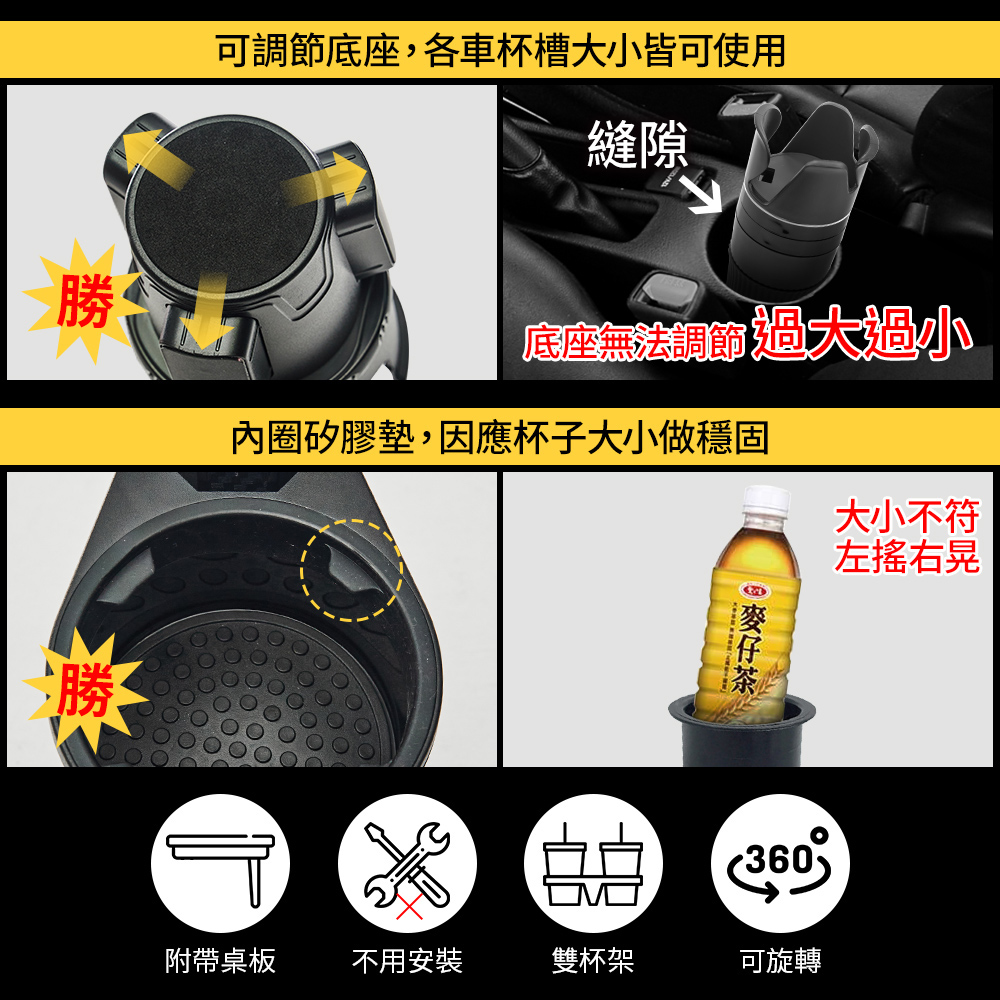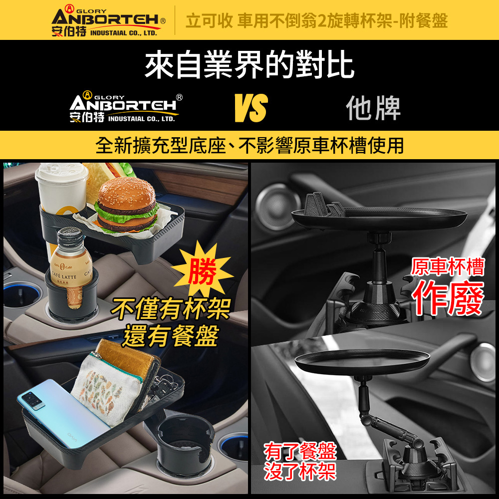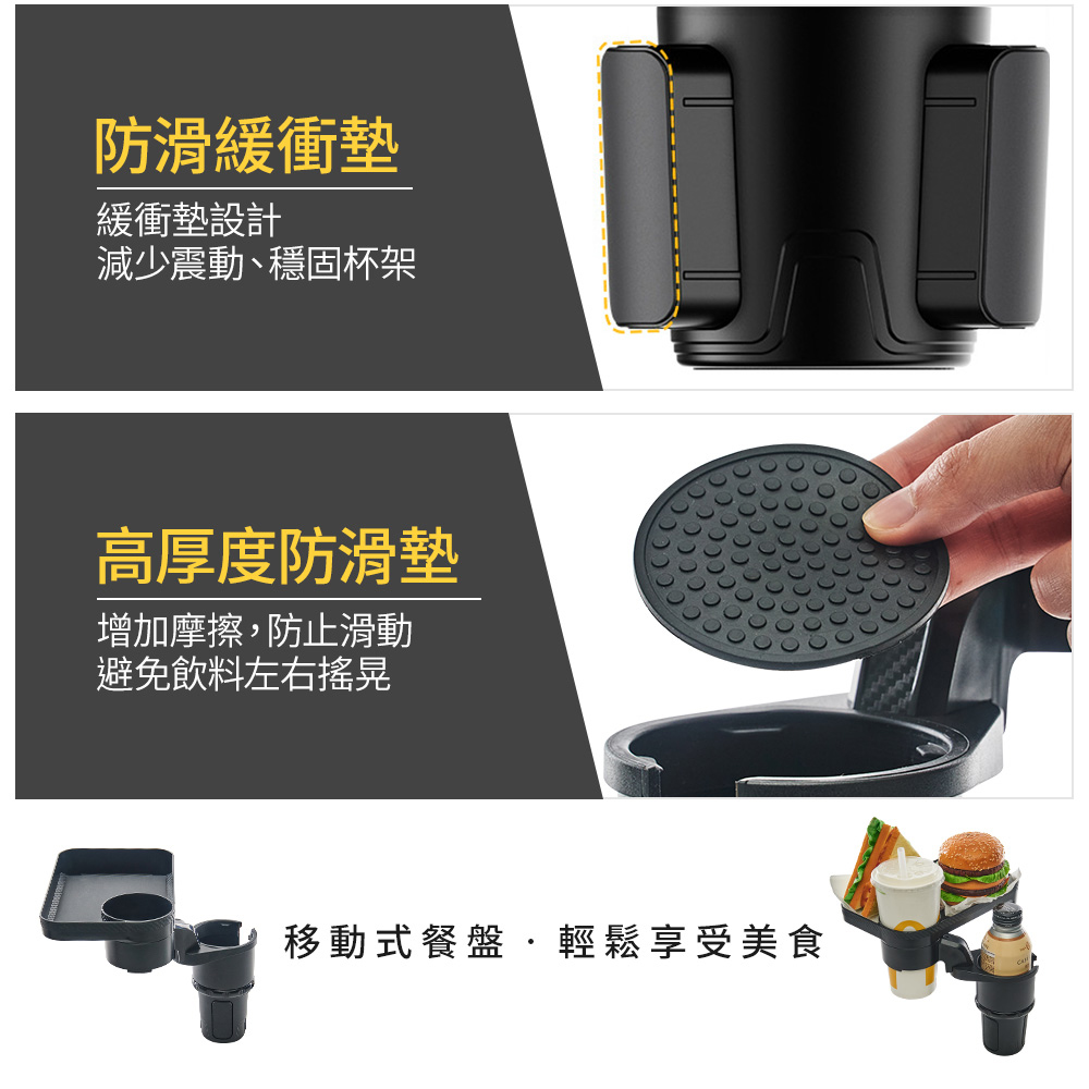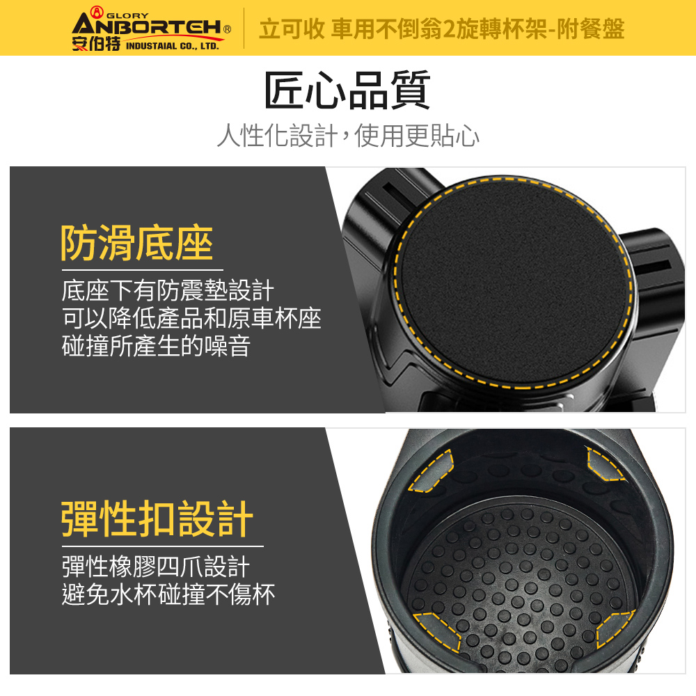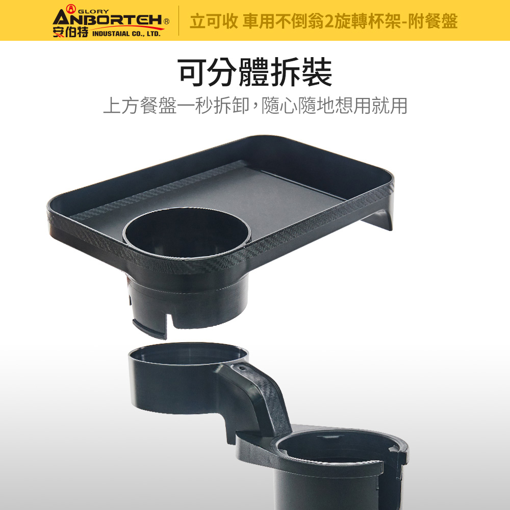 【安伯特】車用不倒翁2旋轉杯架-附餐盤立即擁有餐盤!車上也能享受美食~ 【安伯特】車用不倒翁2旋轉杯架-附餐盤二合一 : 杯架餐盤,全新二合一雙杯架 : 杯架擴充術,一分為二可擴張 : 底座擴張,根據杯槽大小調整可旋轉 : 360度旋轉式餐盤可拆裝 : 餐盤可分體拆裝免安裝 : 不需安裝,輕巧便攜彈性扣 : 避免水杯碰撞不傷杯緩衝墊 : 減少震動,穩固杯架防滑墊 : 防止滑動,避免左右搖晃