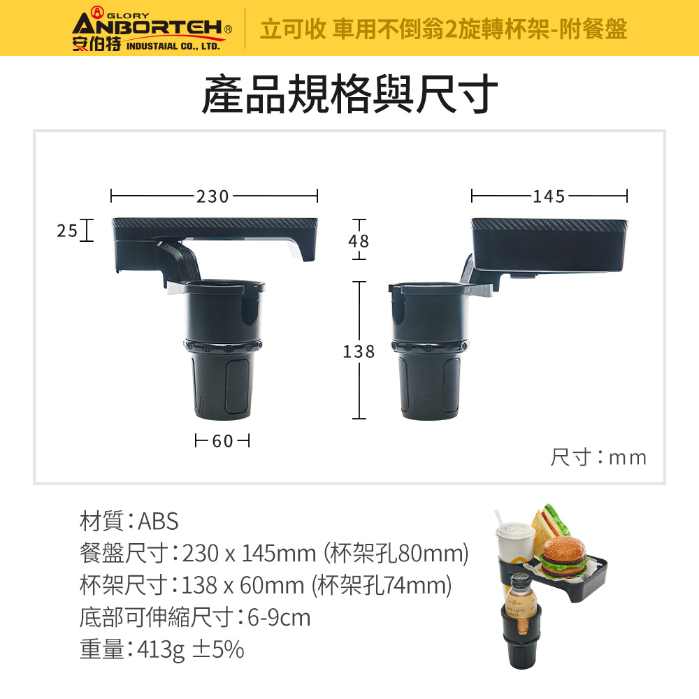 商品規格品名:【安伯特】車用不倒翁2旋轉杯架-附餐盤料號:ABT-A105 材質:ABS餐盤尺寸:230x145mm (杯架孔80mm) ±5%杯架尺寸:138x60mm (杯架孔74mm) ±5%重量:413g ±5%保固範圍:新品暇疵產地:中國(台灣監造) 材積:165x110x235 mm