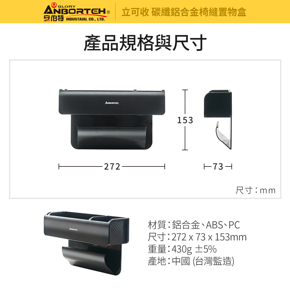 商品規格品名:【安伯特】碳纖鋁合金椅縫置物盒料號:ABT-A088材質:鋁合金、ABS、PC尺寸:272x73x153mm ±5%重量:430g ±5%保固範圍:新品暇疵產地:中國(台灣監造)