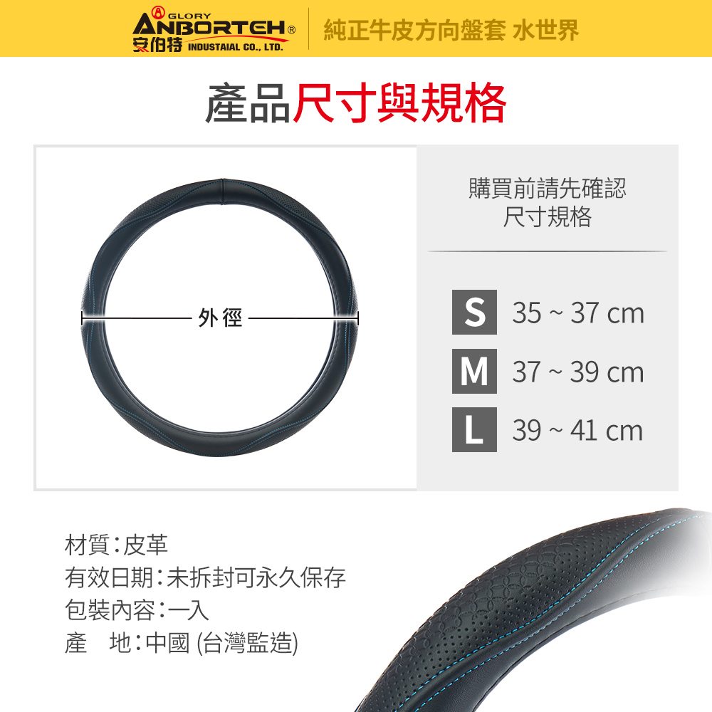 商品規格品名:【安伯特】純正牛皮方向盤套(水世界)型號:ABT-A098材質:皮革尺寸:S(35~37cm)、M(37~39cm)、L(39~41cm)重量:935g ±5%保固範圍:新品暇疵產地:中國(台灣監造)