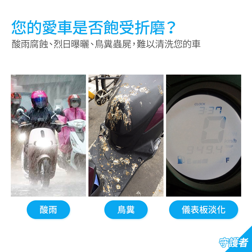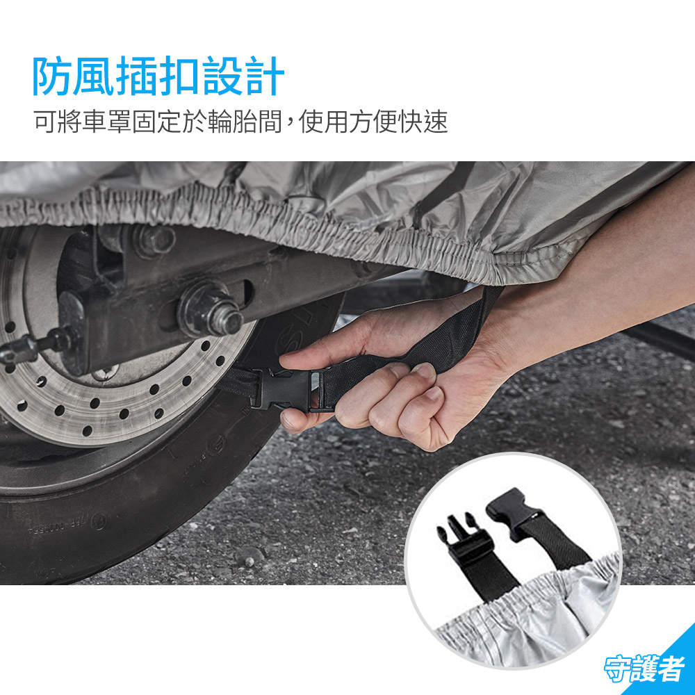防曬-避免陽光直接曝曬防水-阻隔酸雨侵蝕車漆車殼防風-前鎖孔和防風扣可固定車罩防塵-抵擋鳥糞泥沙等附著防刮-預防樹枝石頭直接刮傷表面防盜-前輪防盜鎖可搭配機車鎖