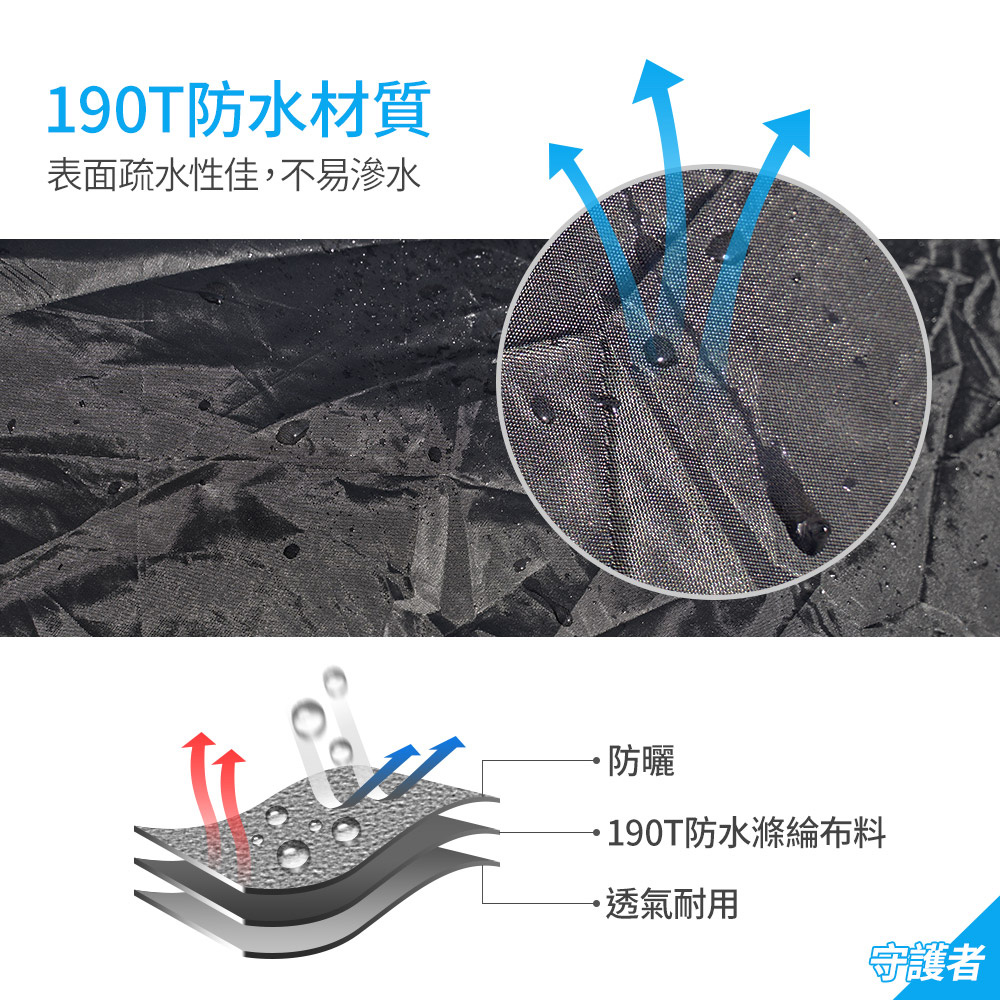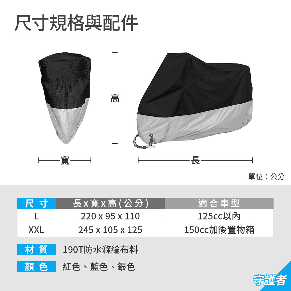商品規格品名:【守護者】摩托車防曬防刮機車罩材質:190T防水布料尺寸:L(220x95x110cm ±5%)、XXL(245x105x125cm ±5%)保固範圍:新品暇疵產地:中國(台灣監造)