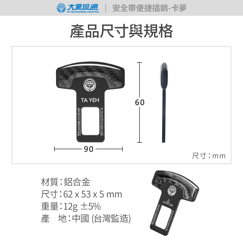 商品規格品名:安全帶便捷插銷-卡夢材質:鋁合金尺寸:62x53x5mm重量:12g ±5%保固範圍:新品暇疵產地:中國(台灣監造)