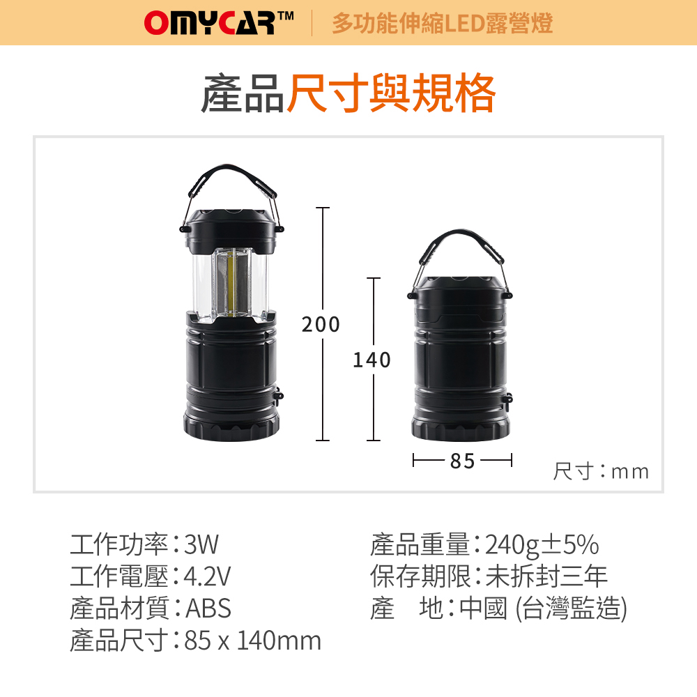 商品規格品名:【OMyCar】多功能伸縮LED露營燈材質:ABS尺寸:85x140mm ±5%重量:240g ±5%工作功率:3W工作變壓:4.2V保存期限:未拆封三年保固範圍:新品暇疵產地:中國(台灣監造)