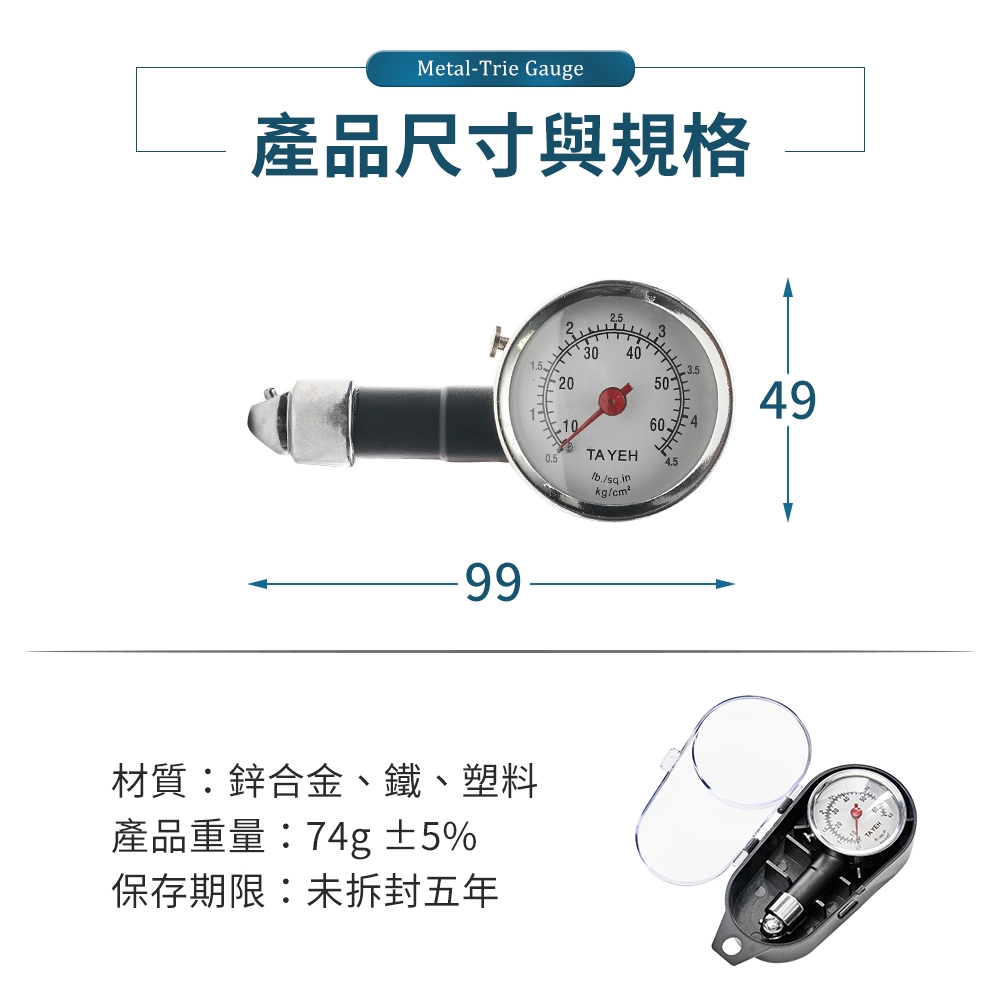 商品規格品名:金屬胎壓錶料號:TA-D026材質:鋅合金、鐵、塑料重量:74g ±5%保存期限:未拆封保存五年保固範圍:新品暇疵產地:中國(台灣監造)
