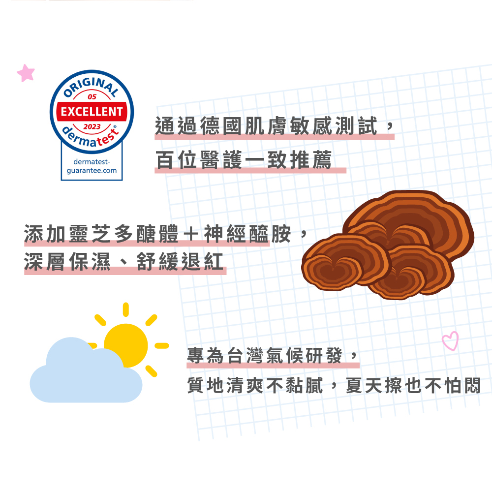 【專為敏弱肌寶寶設計的全家乳液】通過德國肌膚敏感測試,醫護嚴選冠軍乳液添加靈芝多醣體+神經醯胺,深層保濕、舒緩退紅質地清爽不黏膩,夏天也不怕悶全身/臉部皆可擦,CP值超高!兩款香味選擇:無香款/ 經典香