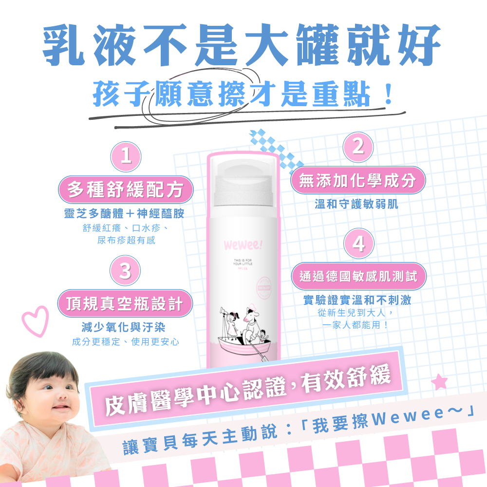 1.商品品名: Wewee!寶貝潤潤乳-無香款2.商品重(容)量:150ml/瓶3.內容物成分:Pure Water, Glycerin, Isopropyl Myristate, 1,3-Butanediol, Olive Oil, Grape Seed Oil, Sweet Almond Oil, Emulsifier, Vitamin E, Ceramide, Jojoba Oil, Shea Butter, Beta Glucan, Glycyrrhizic Acid, Panthenol, Phenoxyethanol4.原產地(國):台灣