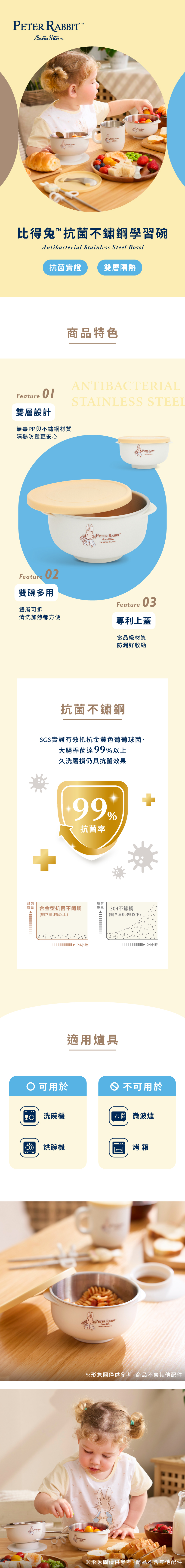 ■ 商品說明:抗菌不鏽鋼:抗菌銅離子與304不鏽鋼經過合金製成,強化抗菌力,不含鉛,耐酸性、抗腐蝕、不釋放有害物質,且經久洗磨損仍具抗菌效果。雙層隔熱:無毒PP與不鏽鋼雙層保護,安心盛裝不燙手。雙碗多用:自由拆組使用,不鏽鋼碗還能電鍋加熱,且方便徹底清潔。專利上蓋:食品級PE蓋可卡扣好握匙(好握匙可另購),直覺收納,安心防漏外帶便利。